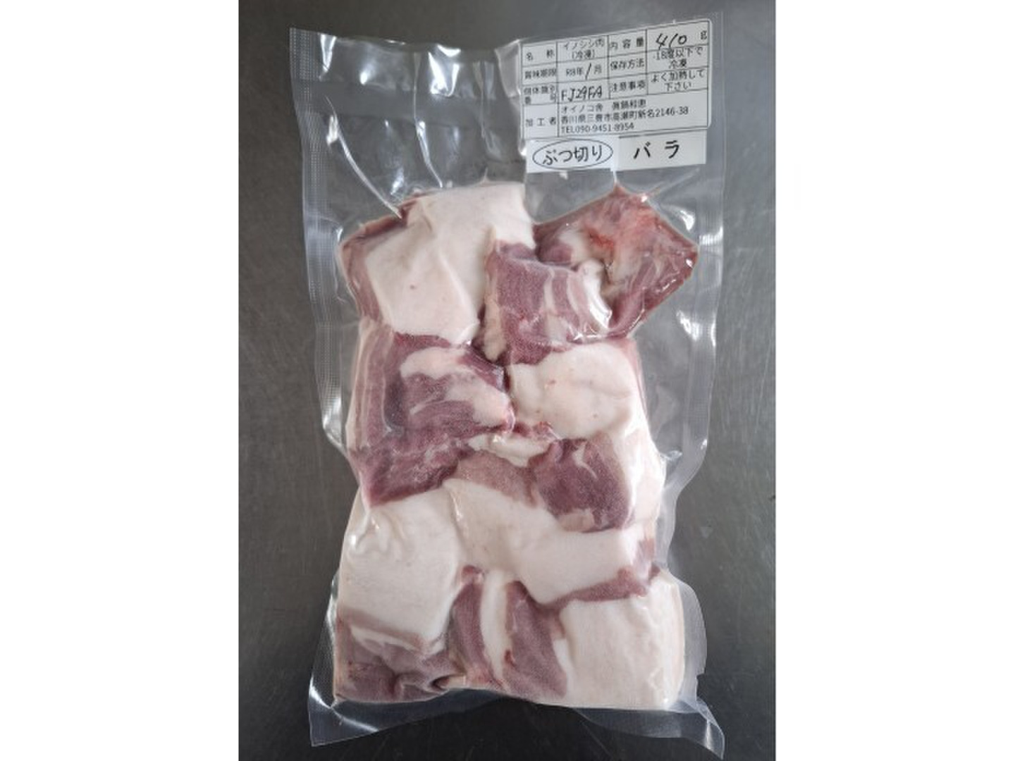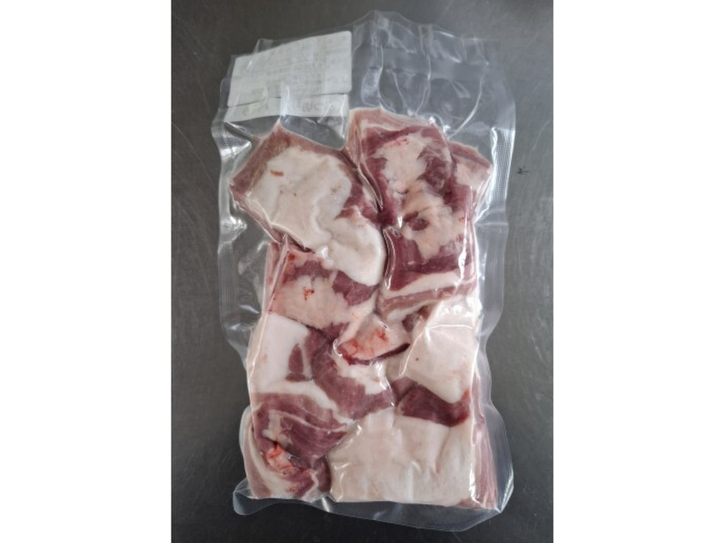 脂の乗ったバラ肉を一口サイズのブツ切りにしています。