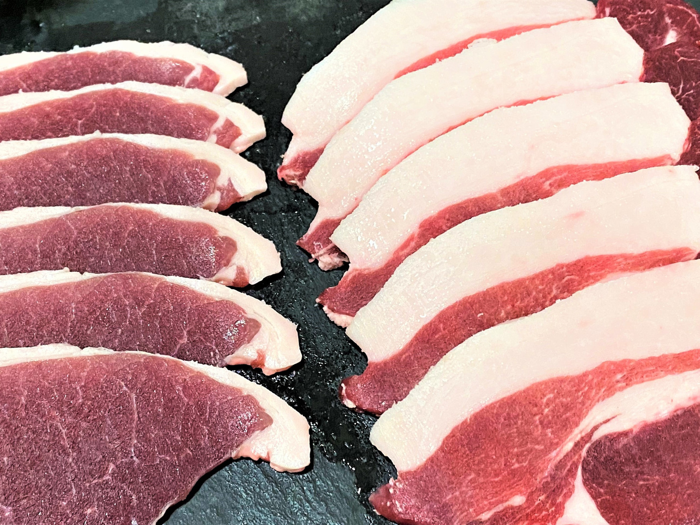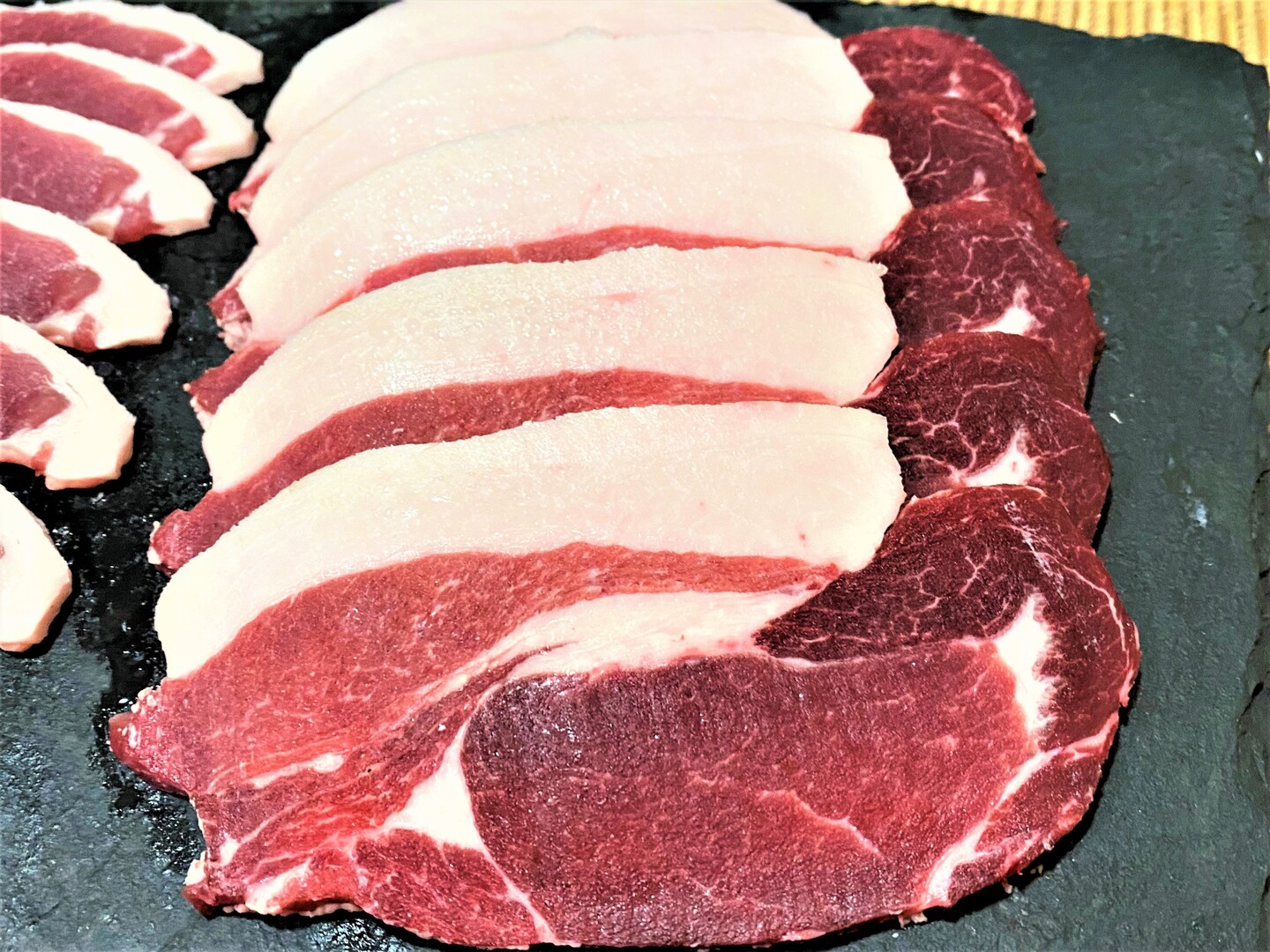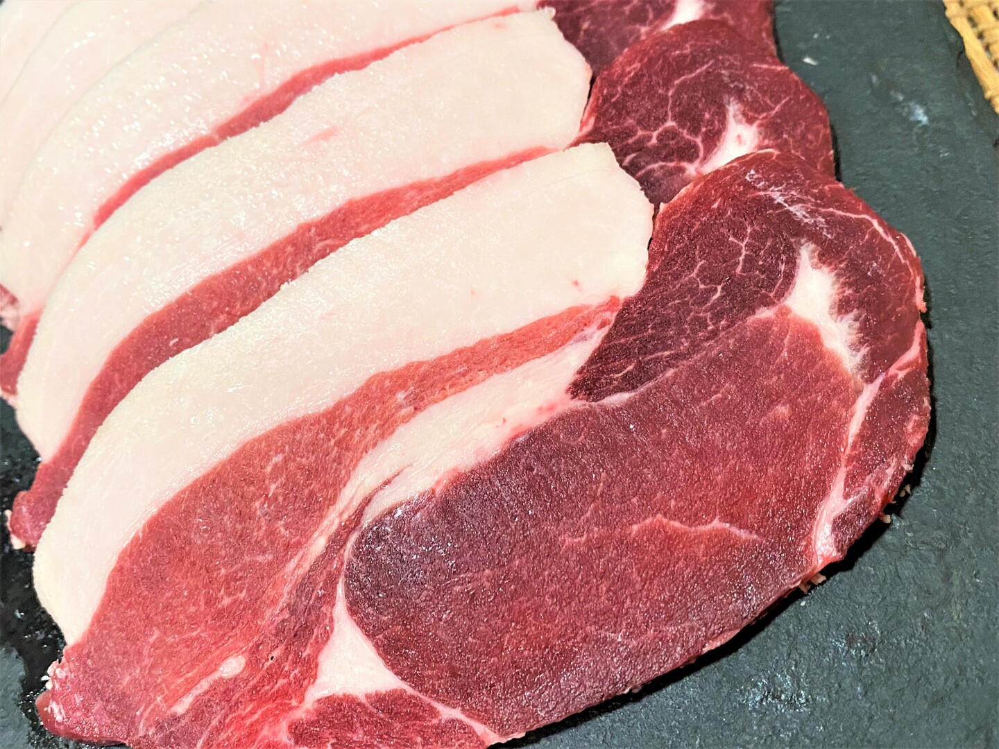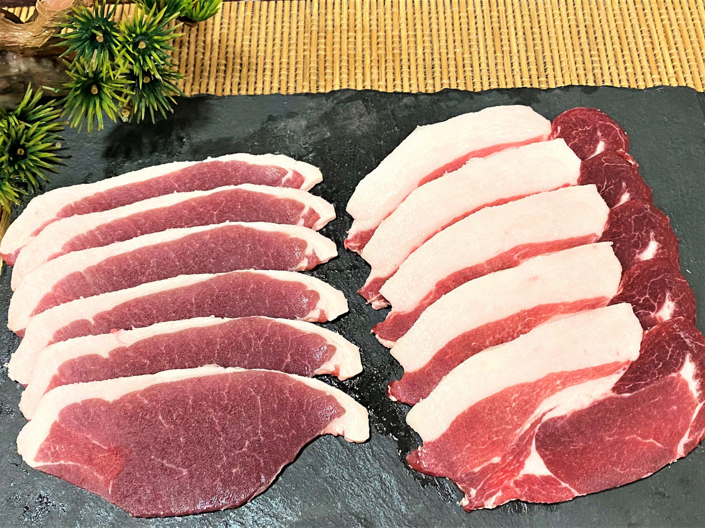衛生的な処理施設からのお肉・スライス1枚1枚丁寧に並べ真空(120g~180gずつ小分けにしてあります)