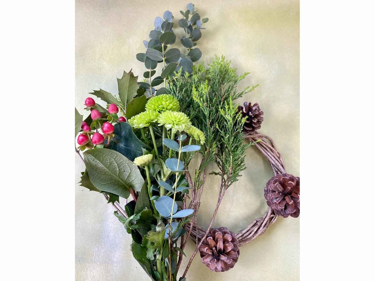 裏山で採れた蔦、ユーカリ、松ぼっくり等を中心に季節の花をお送りいたしますので、ご自分で好きなようにセットしてみてください。