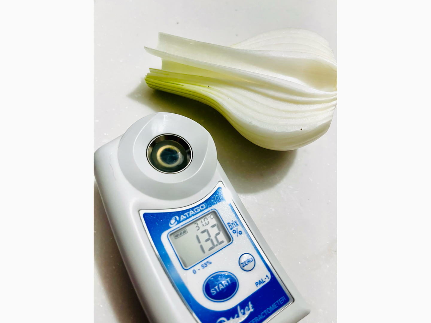 野菜のおいしさは鮮度やバランス、いろいろな要素があり、糖度だけではないというのがわたしたちの考えですが、購入くださるお客さまたちにはひとつの気になる指標かと思い糖度計を使用してみたところ最高糖度13.2をマーク:) 玉ねぎの糖度は通常5%くらいと言われますからいかに甘いかが数字でわかりました☺︎