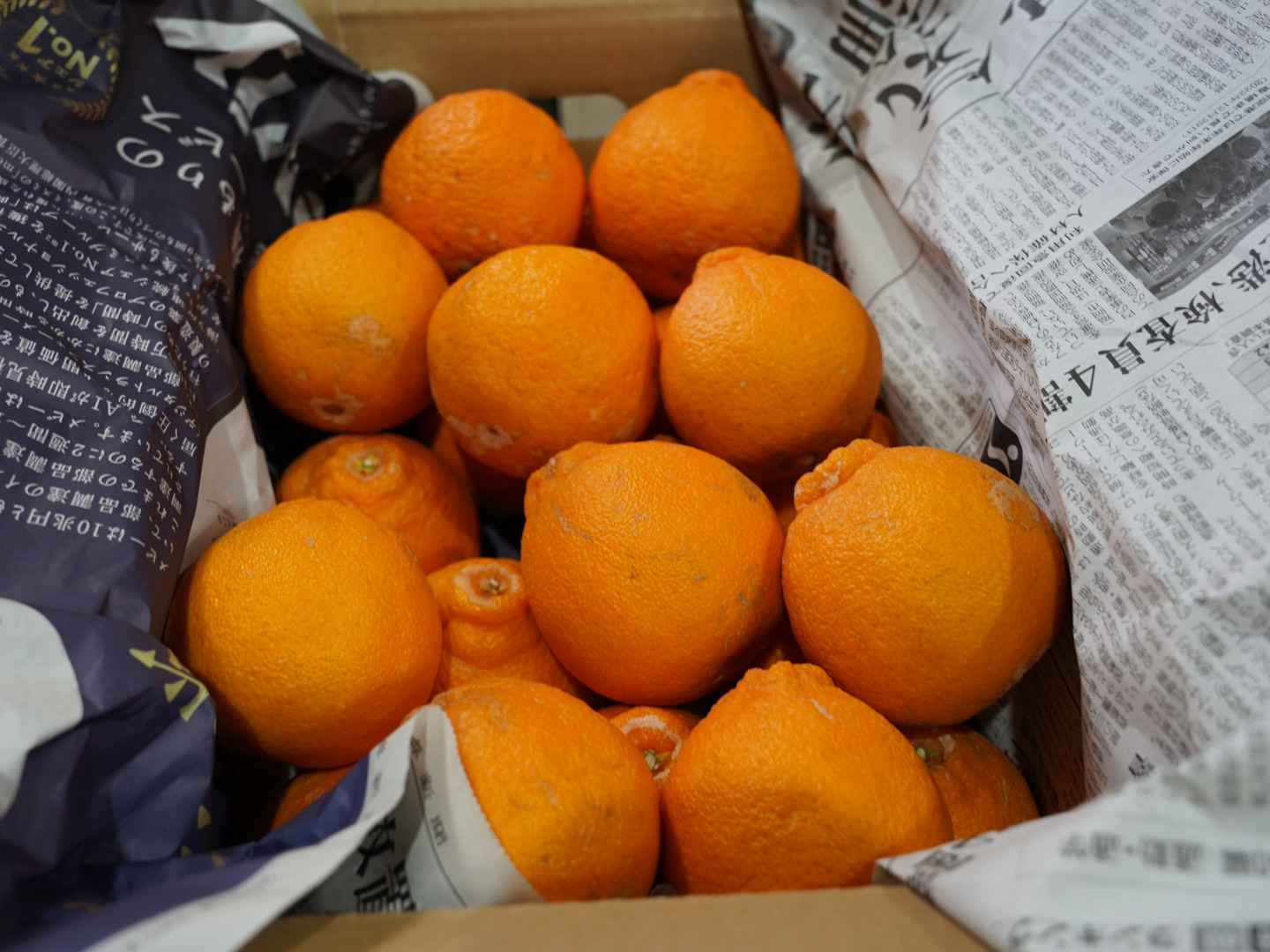 蜜柑の鮮度が落ちづらいよう、箱の中に新聞紙を引いて発送させていただきます。