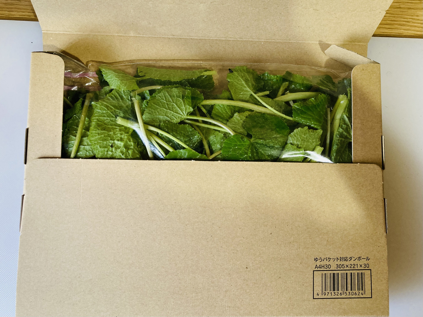 ※輸送コストを考えての常温発送ですが、届きましたら、すぐに冷水に浸していただく(水揚げ)と、しなった葉わさびがシャキンと復活します。
