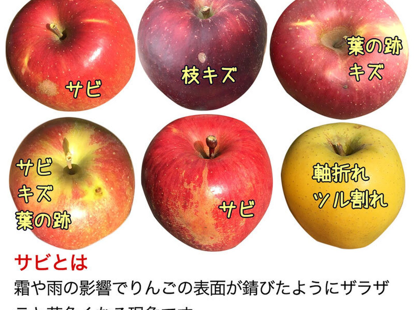 ※サビ(しぶ):霜や雨の影響でりんごの表面が部分的に金属の錆びようにザラザラ・ボコボコと茶色くなる現象です。