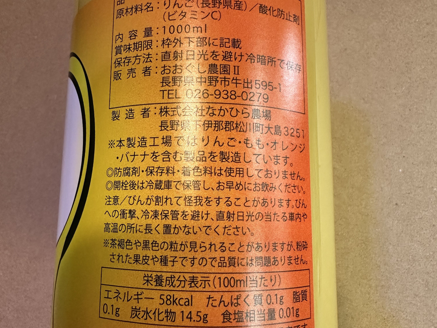 おおぐし農園2の商品である「サンふじ」と「スーパームーンりんご」隠し味で少し「シナノスイート」を皮ごとすりおろして混ぜ合わせてみたら、偶然ちょうどいい比率を発見しました☆その名も「偶然生まれたりんごジュース」。1本のりんごジュースには約8個分の完熟りんごを贅沢に使用しています♪