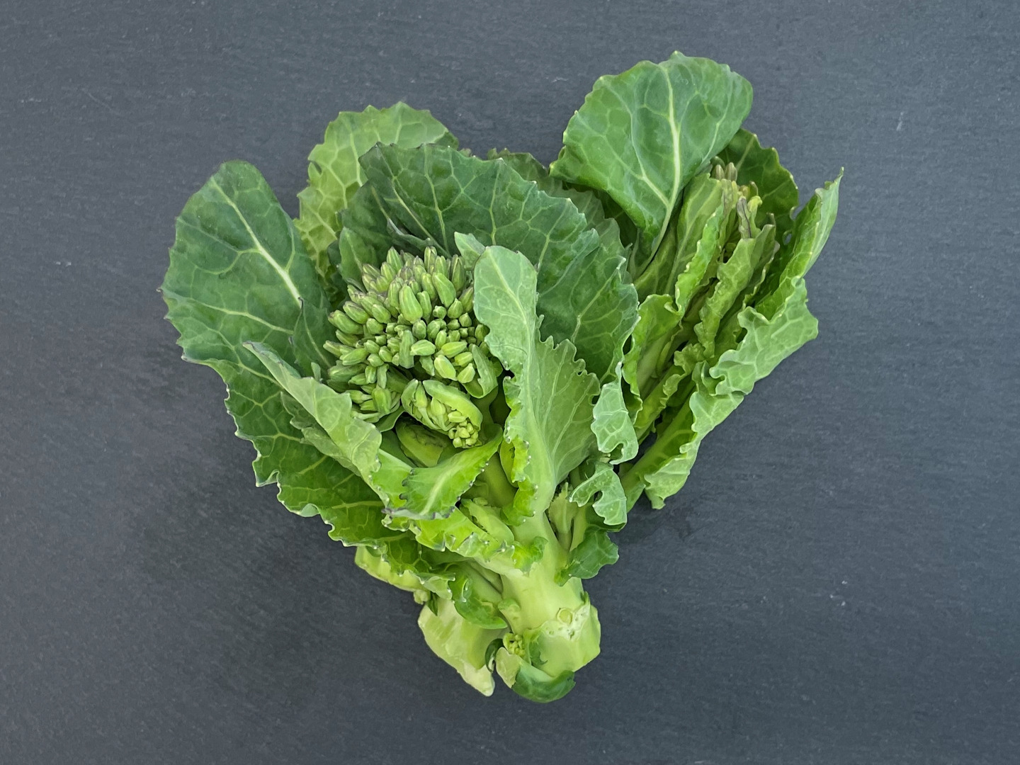 「ケール花芽」は同じアブラナ科の春の味覚「菜の花」に近い味わいで、ケールの葉よりえぐみ(青菜特有の強い味)が少なく、その分旨味や甘みが感じられやすい特長があります。小さなつぼみや茎、葉はどれも柔らかく、さっと火を通すことで一層甘さが引き立ちます。