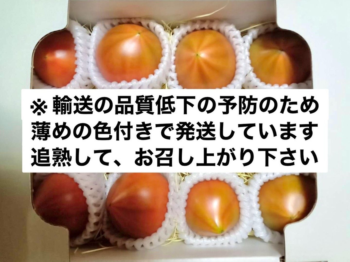 完熟トマトだと、輸送中に痛む恐れがあるため色付きが薄めの状態で出荷しています。到着後、追熟させる事で甘味が増して、より美味しくお召し上がり頂けます。直射日光を避け常温で真っ赤になるまで追熟させるのがオススメです。完熟後は、ビニール袋に入れて野菜室で保存して頂けると日持ちします。