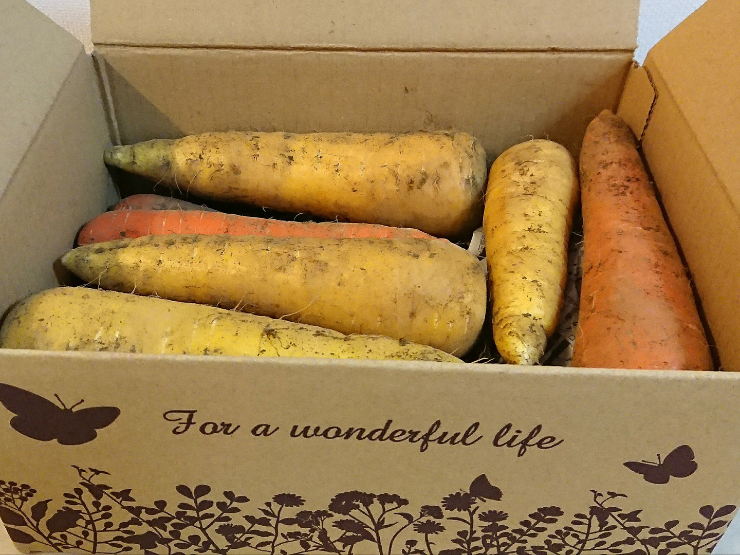 掘りたての人参(黄色と紅色の2色)を60サイズの箱に約1.8kg、クール便でお届けします。