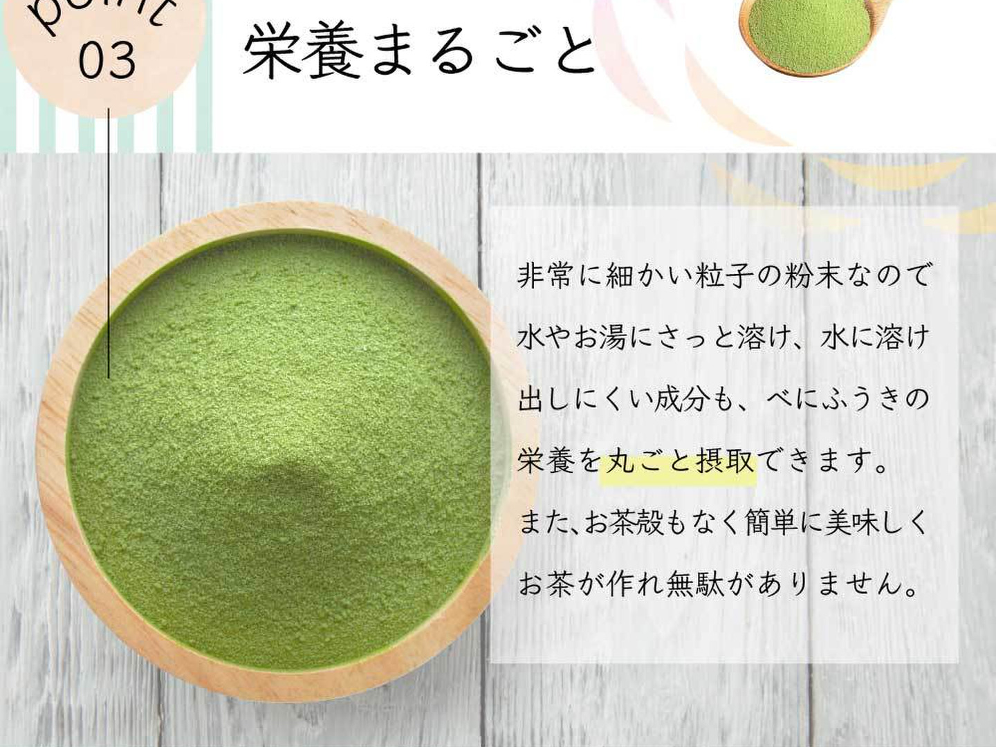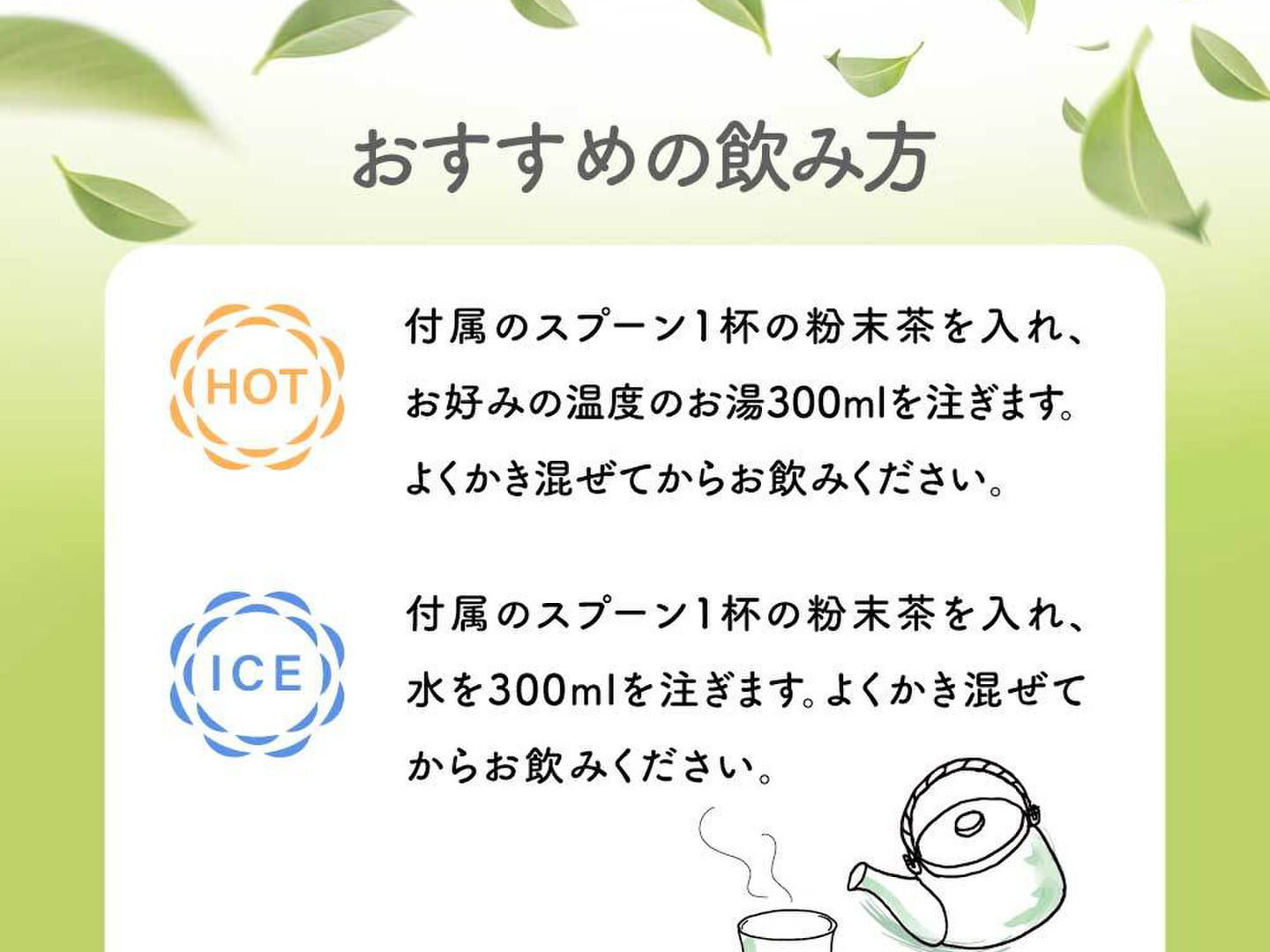 べにふうき品種の独特の香りとほろ苦さが楽しめる緑茶です!粉末茶なので水やお湯に溶けやすく、茶殻が出なく淹れるのが簡単。さらに抽出して淹れる煎茶では摂取することのできない水不溶性成分を丸ごと摂取することができます。
