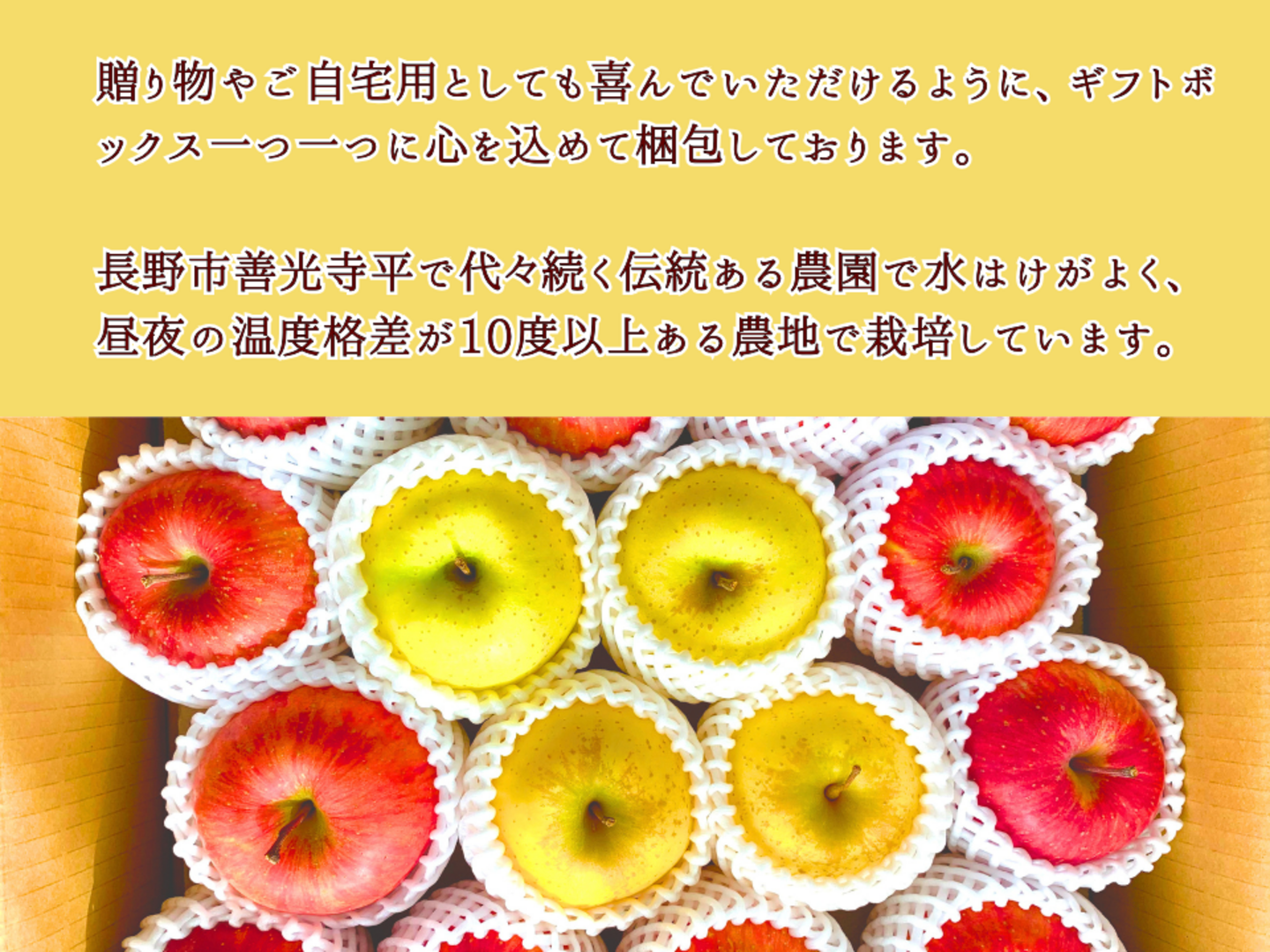 長野県長野市の山間で栽培しており、日照時間が長く、太陽の光をたっぷり浴びているため、糖度が高く甘いりんごが栽培できています。水はけがよく、昼夜の温度格差が10度以上ある農地のため、高糖度なりんごを栽培するのに最も適した環境で栽培しております。りんごの木に水は必要ですが、吸収する水が少ないほどより一層果実が甘くなる性質があります。また、温度格差により、りんごの夜間の呼吸を抑制します。無駄なエネルギーが抑えられ、より甘いりんごが栽培できます。