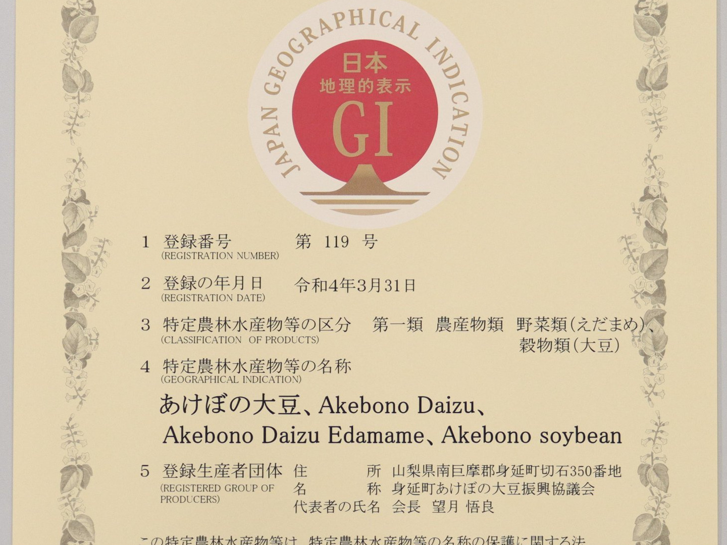 身延町曙地区で採取した種子を使い、身延町内で栽培したものだけが「あけぼの大豆」を名乗れます。令和大嘗祭にも供納しました。