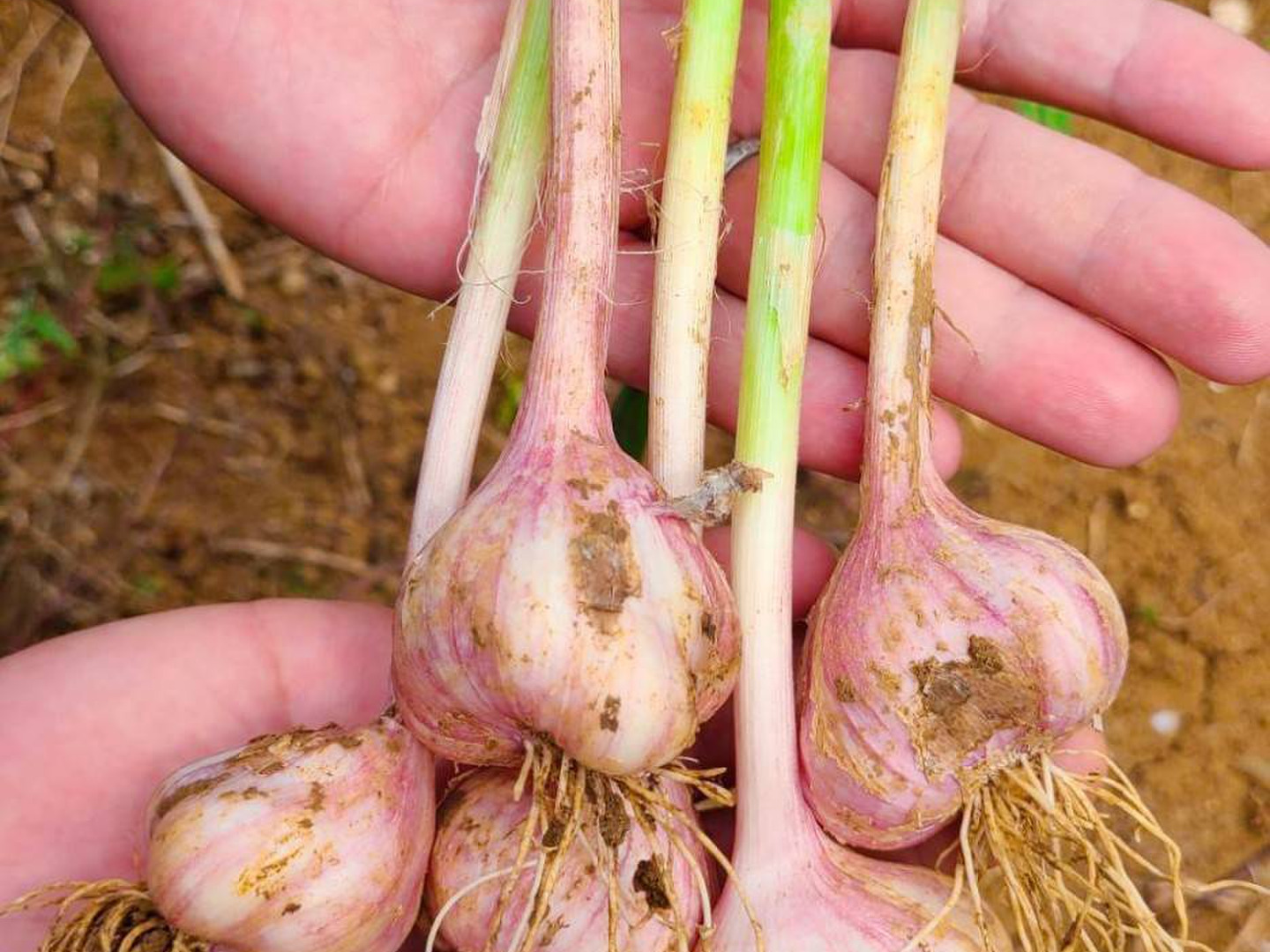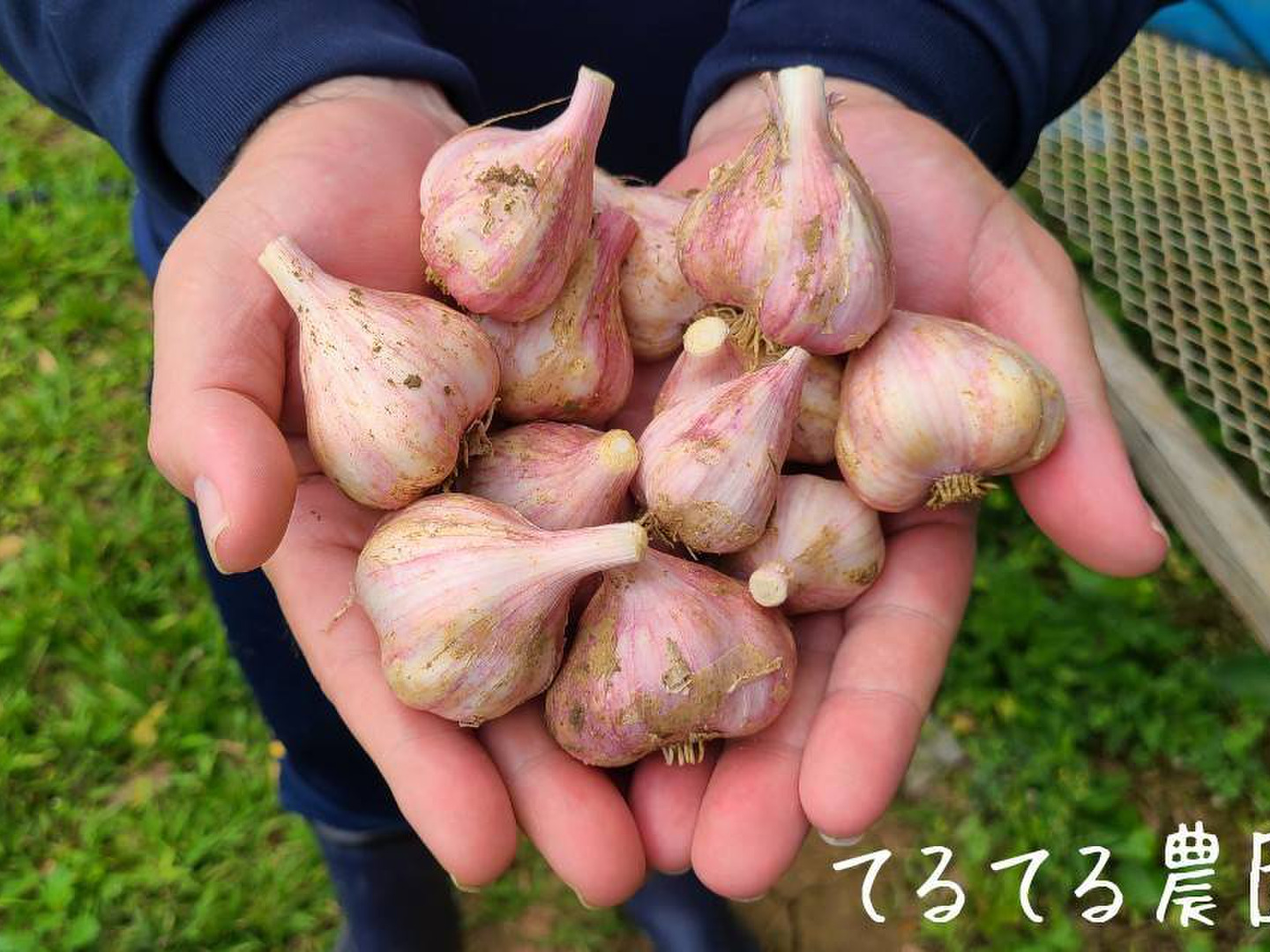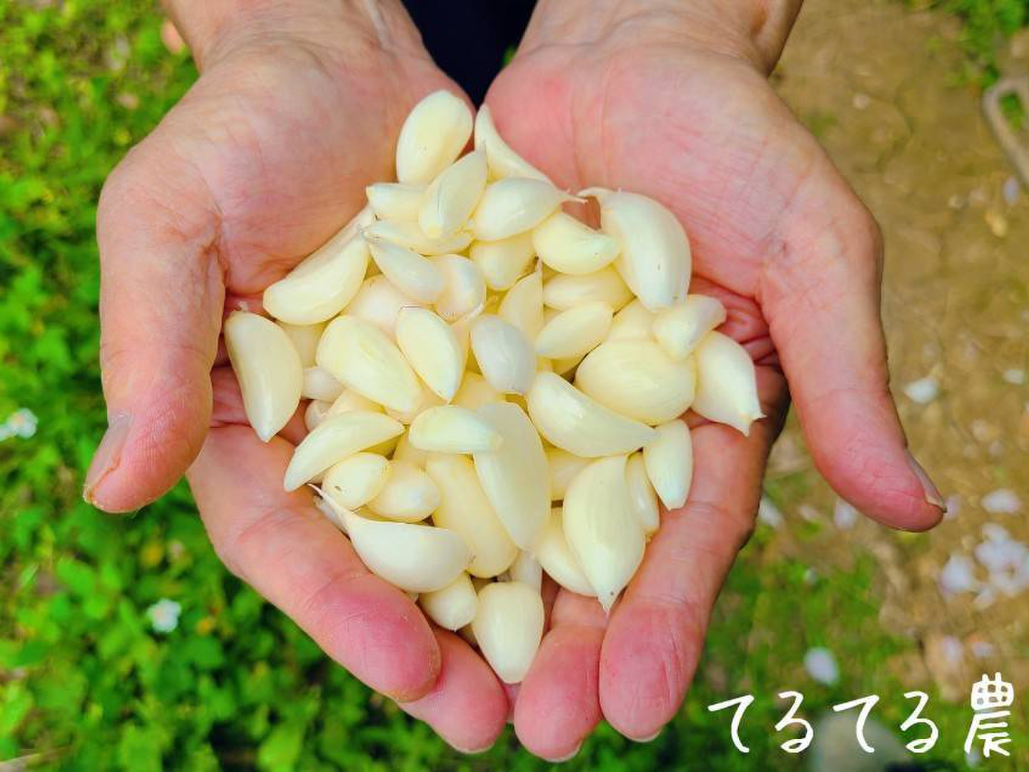 本土で収穫される北方系のにんにくと異なり、たくさんの小鱗片ができる南方系のにんにくで「縁起のいい子宝のにんにく」と言われています。外皮は所々に赤みがかっていますが、中の実は白色をしています。
