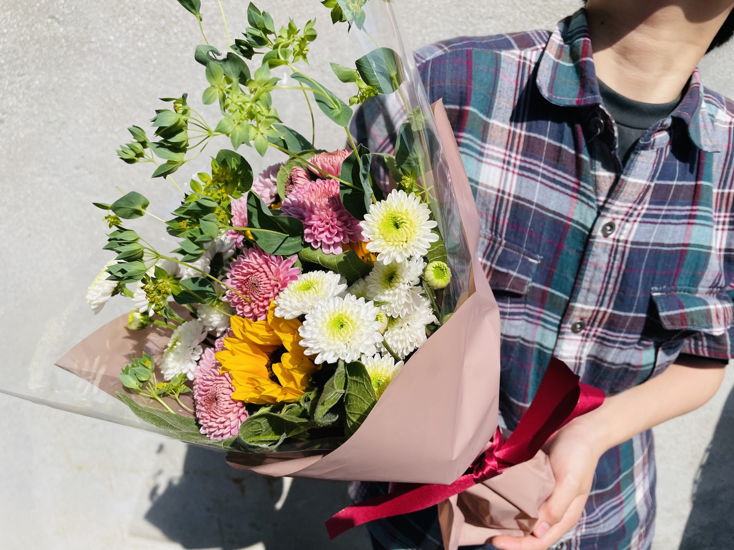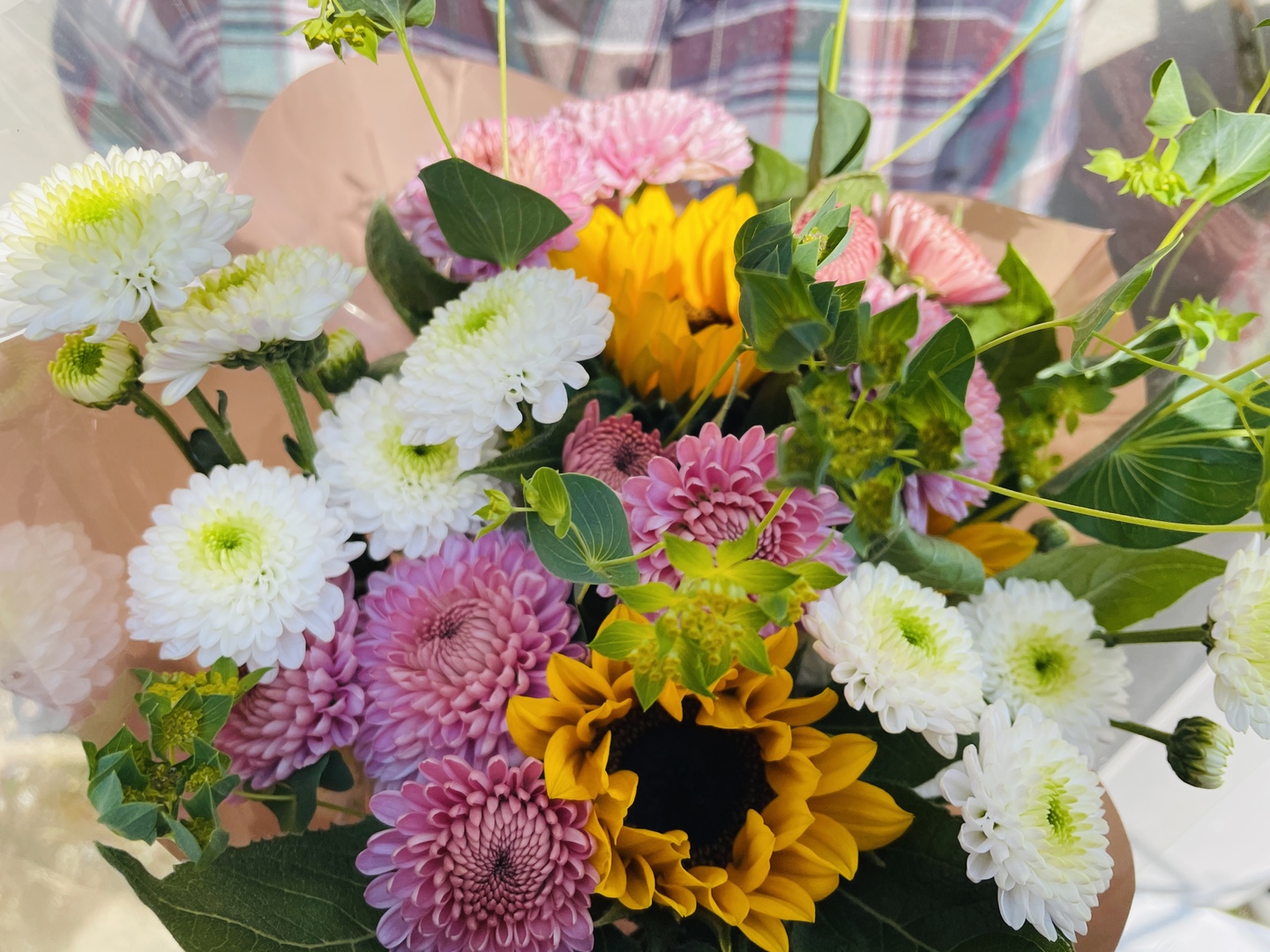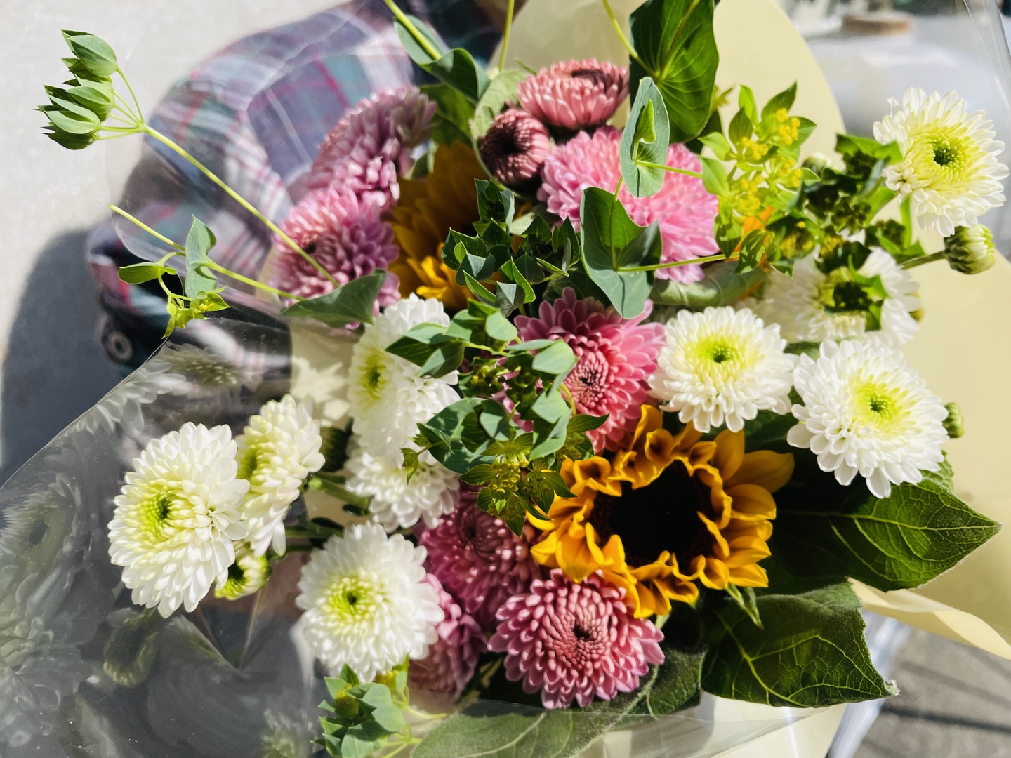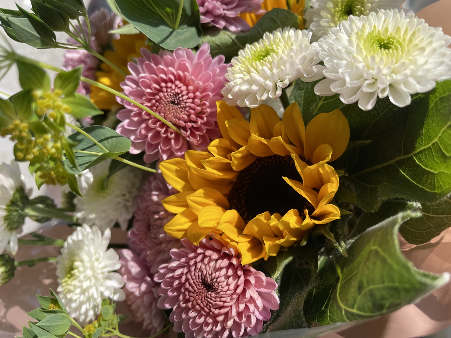 【贈り物にピッタリ!】ひまわりとマムの花束(10本~15本)