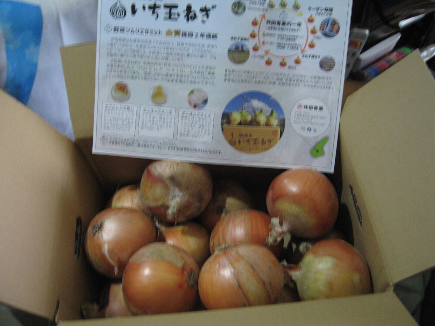 Lサイズを中心に色々なサイズの玉ねぎを1箱(15玉前後)に詰めてお届けします。