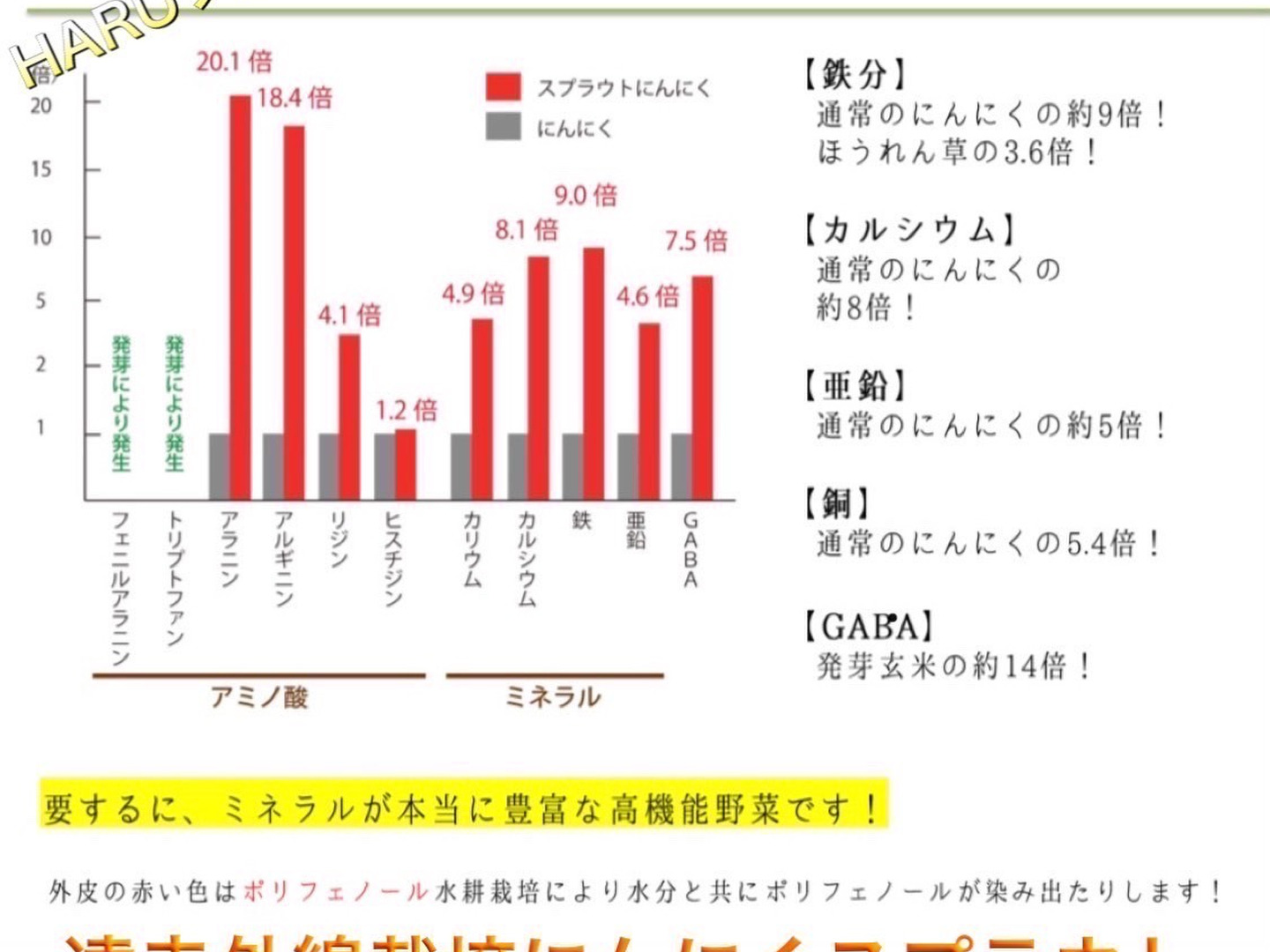 発芽にんにくスプラウトは、大きく成長する為に必要な栄養を最も豊富に含んだ状態なので、通常のニンニクよりも、栄養や酵素がたっぷりと含まれています。