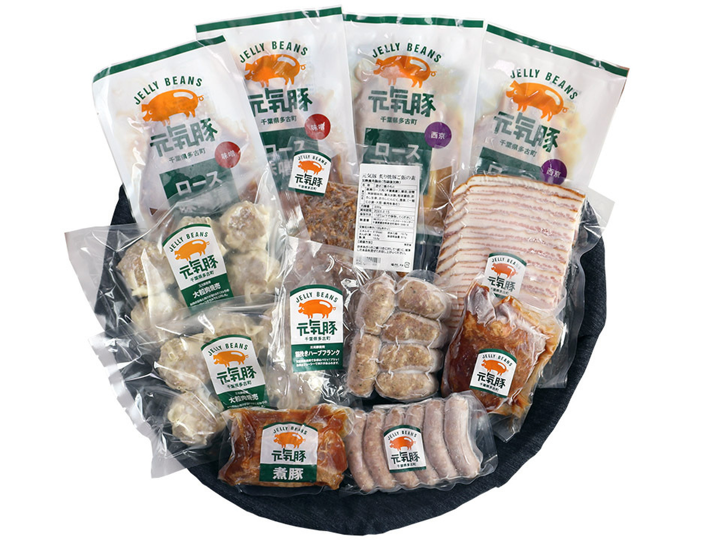 | 内容 | ロース味噌漬…120g×2、ロース西京漬…130g×2、煮豚…300g×1、大粒肉焼売…300g(50g×6個入)×2、炙り焼豚ご飯の素…200g×1、粗挽きハーブフランク…200g(6本入)×1、ウインナー…150g(25g×6本入)×1、ベーコン(スライス)…200g×1、プルドポーク…200g×1 | ||||||