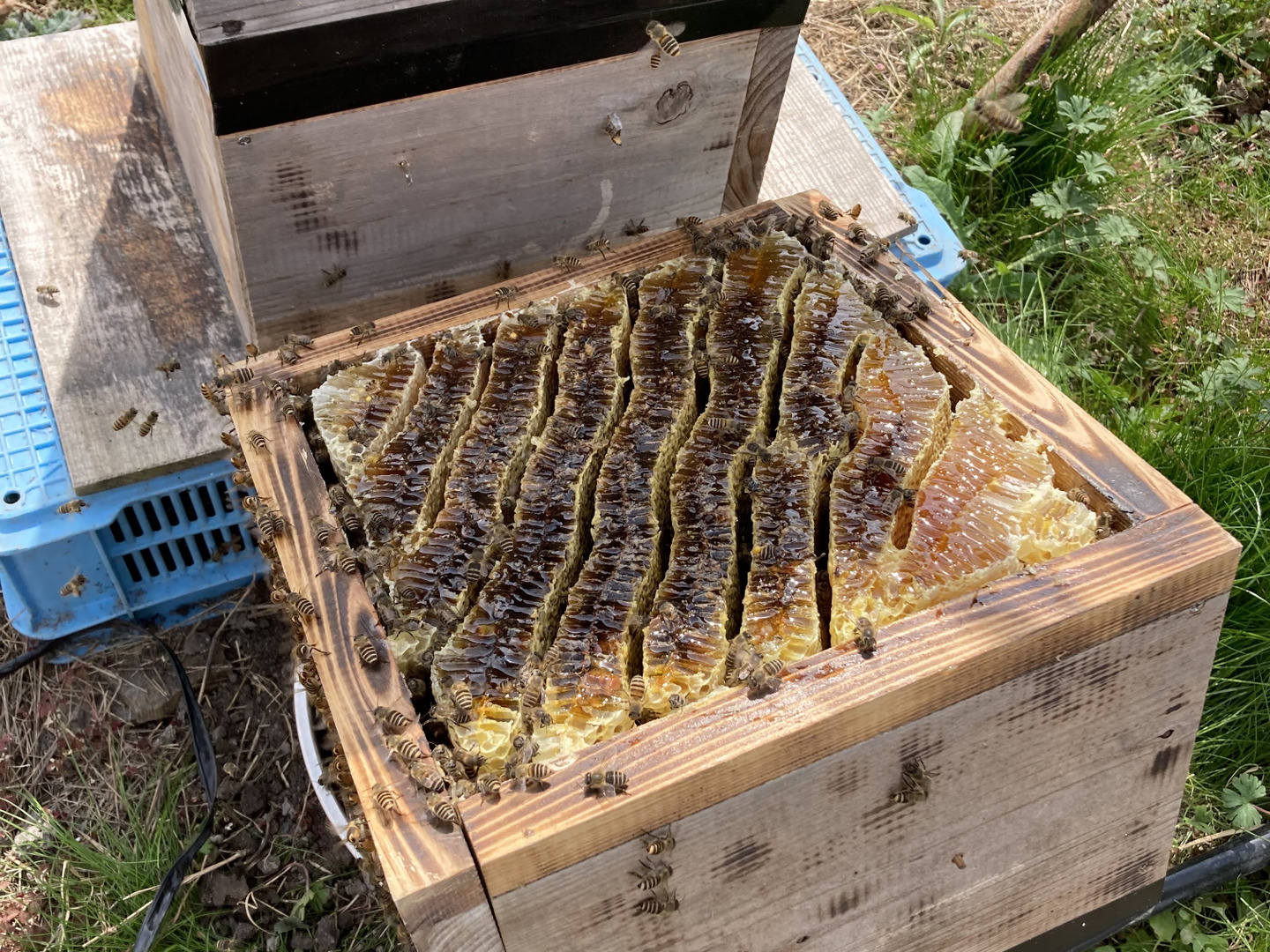 農薬を一切使用していない、ブルーベリー園といちじく畑に巣箱を設置しています。草生栽培にこだわった畑で、ブルーベリーの花はもちろんレンゲやタンポポなどさまざまな季節の花から蜜を集めてくれています。その為、百花蜜とも呼ばれています。