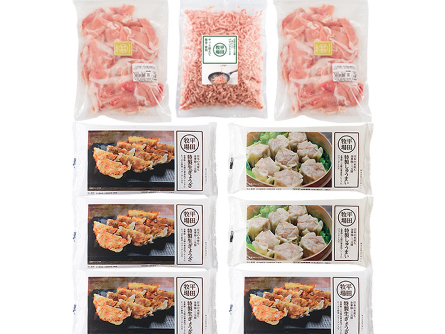 | 内容 | 平田牧場 特製生ぎょうざ(240g/12個入り)×4P、平田牧場 特製しゅうまい(176g/8個入り)×2P、金華豚切出し(500g)×2P、三元豚 おいしいパラパラミンチ(400g)×1P | ||||||