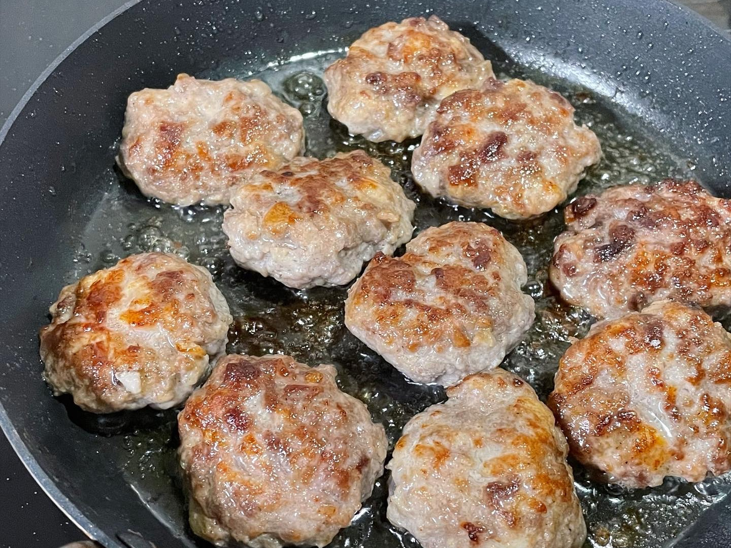 冷凍庫での保存、食べる前に1~2時間ほど冷蔵庫で解凍してフライパンで焼くだけ、脂はハンバーグから出る様に作っているので必要なし!