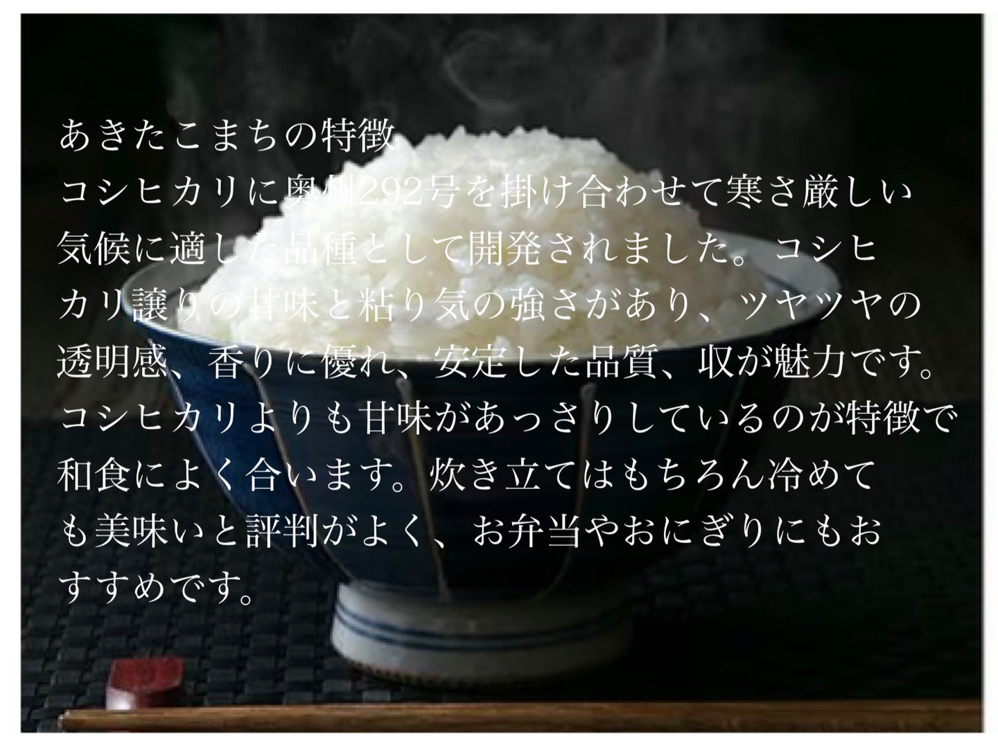 あきたこまちは、炊きあがりの艶やかさ、凛と立つ粒、