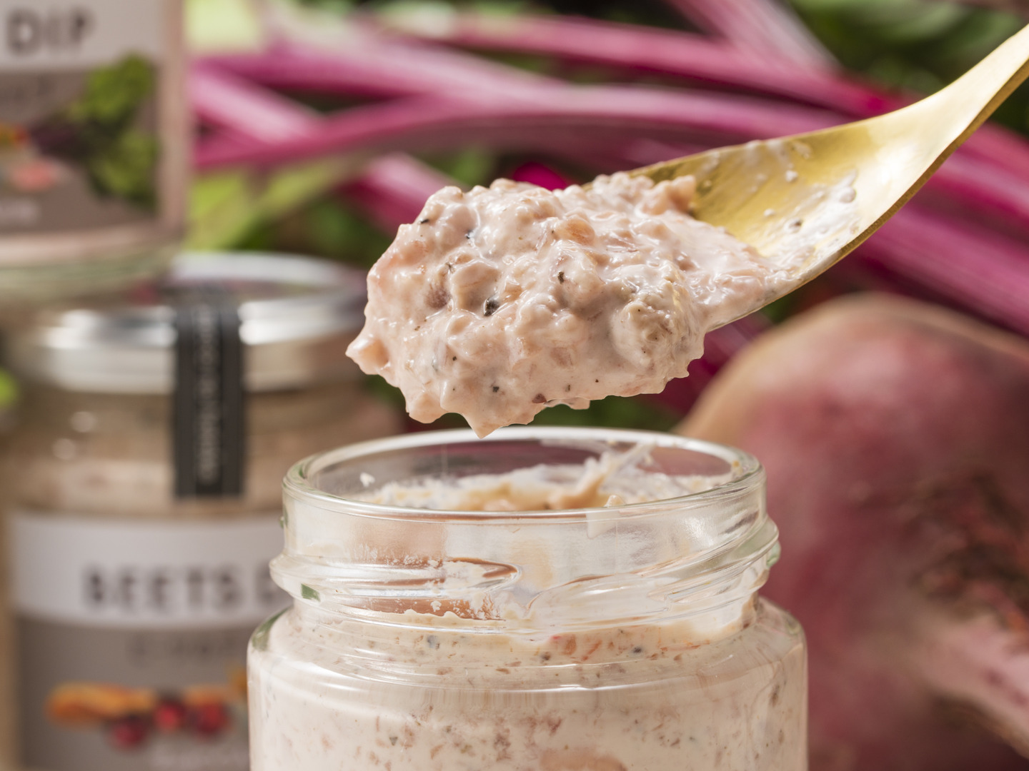 茹でたビーツに食品添加物不使用のマヨネーズ、玉ねぎ、レモン汁を加え、ハーブ(バジル、オレガノ、ディルシード)の香りをプラスしたおしゃれなディップ。