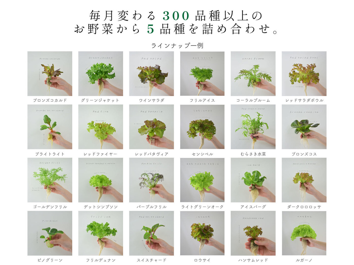 採れたて、無菌栽培、農薬不使用。機能性と栄養バランスを考えた5種の葉物常備野菜です。冷蔵庫で一ヶ月ほど日持ち致します。