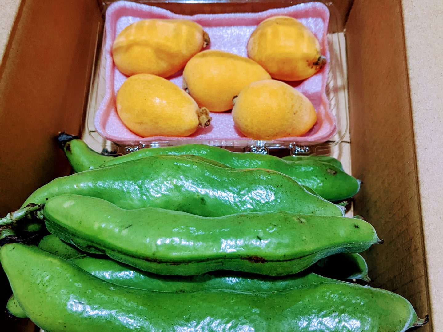 そら豆(お多福) 約20本(大きさ不揃い)と【枇杷(なつたより・茂木)普通Mサイズ~中玉Lサイズ5個(大きさ不揃い)】