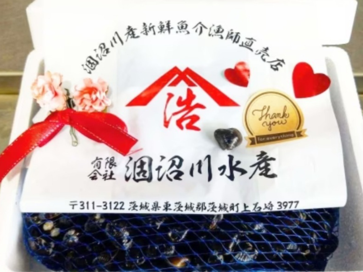 お母様の健康と長寿を願って茨城県涸沼川湖産のしじみはいかがでしょうか。母の日用に赤いカーネーションの造花を透明の袋に入れてご用意します。