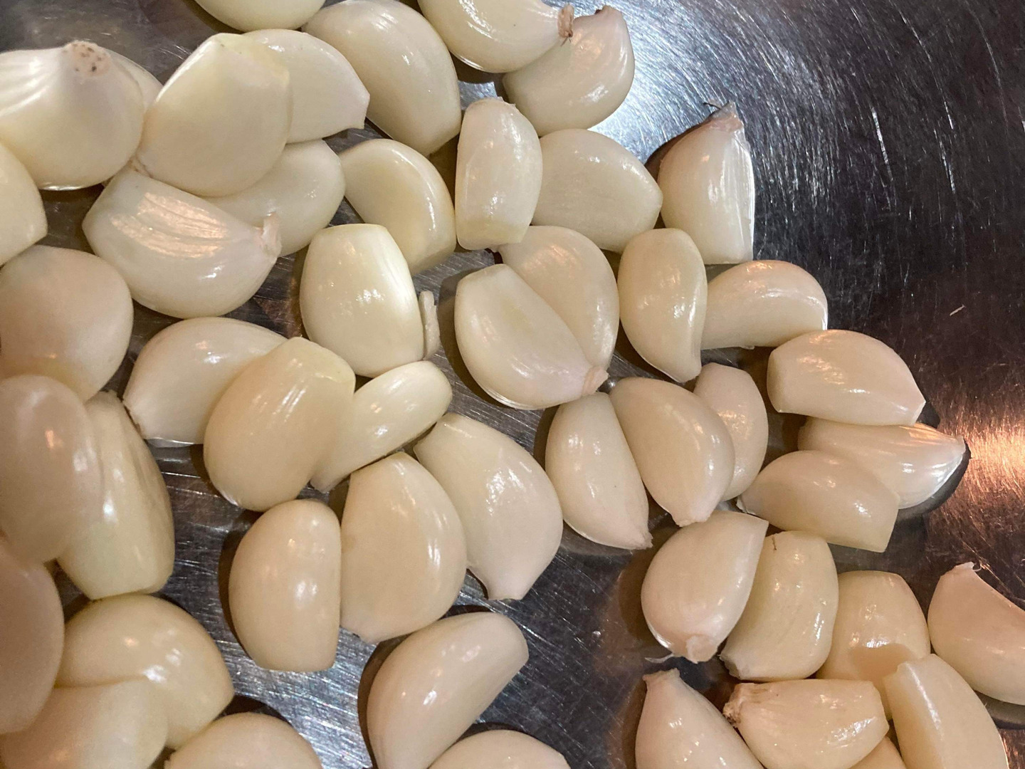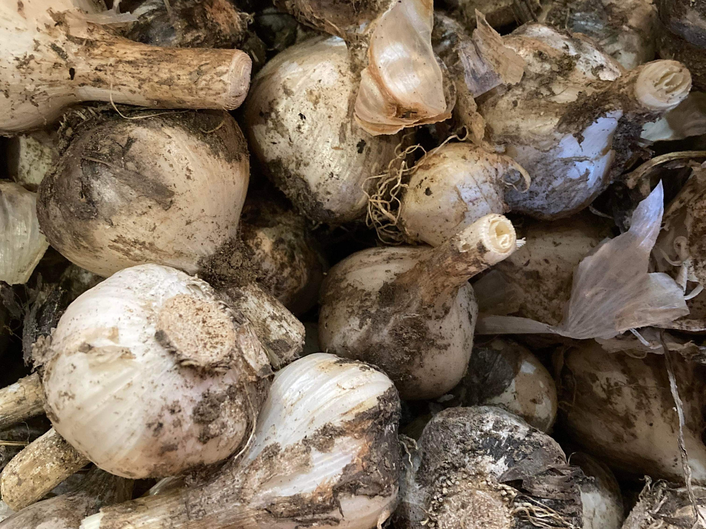 嘉定種という、中国の上海エリアが原産の、暖地栽培に向く品種です。日本で有名なホワイト六片などに比べて、粒が小さく、香りが強く、薬味に向く品種となります。3年前から種採りを始めたもので、農園自家採れの種ニンニクを使用しています。もちろん貯蔵もすべて薬剤などは使用しておりません。