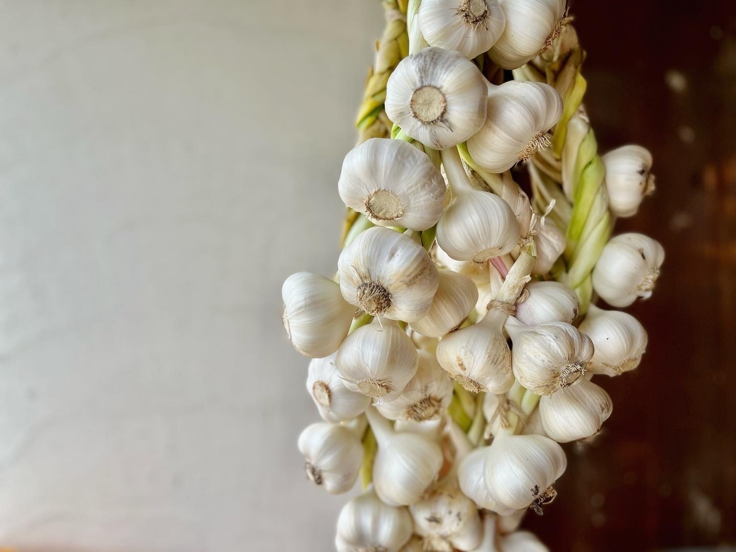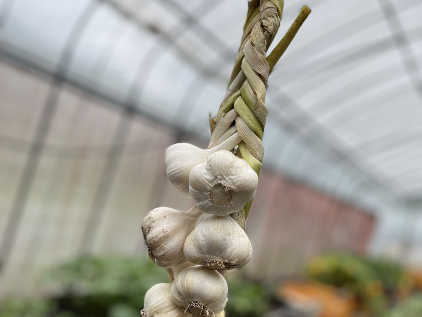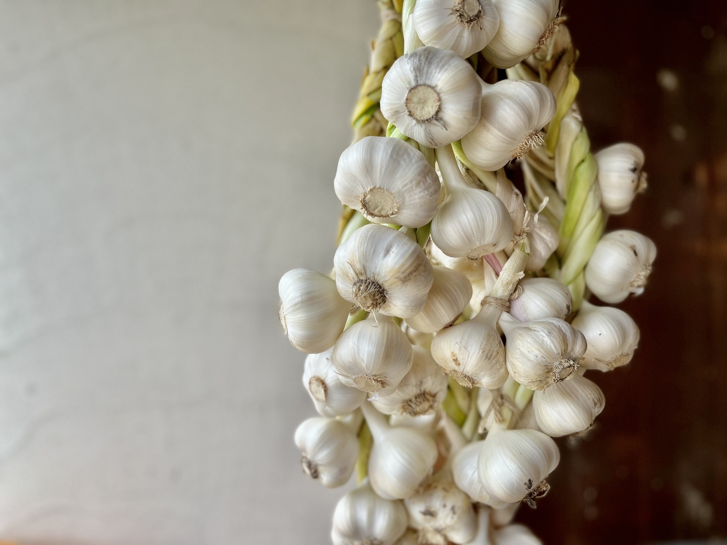 5月に収穫した新ニンニクを10玉編み込み、軒先やベランダ、キッチンに干せるようにしました。