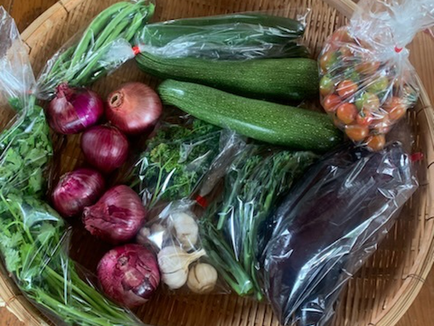 熊本県産赤タマネギ、ニンニク、パセリ、パクチー、ミニトマト、ナス、ズッキーニ全部で3kgほど