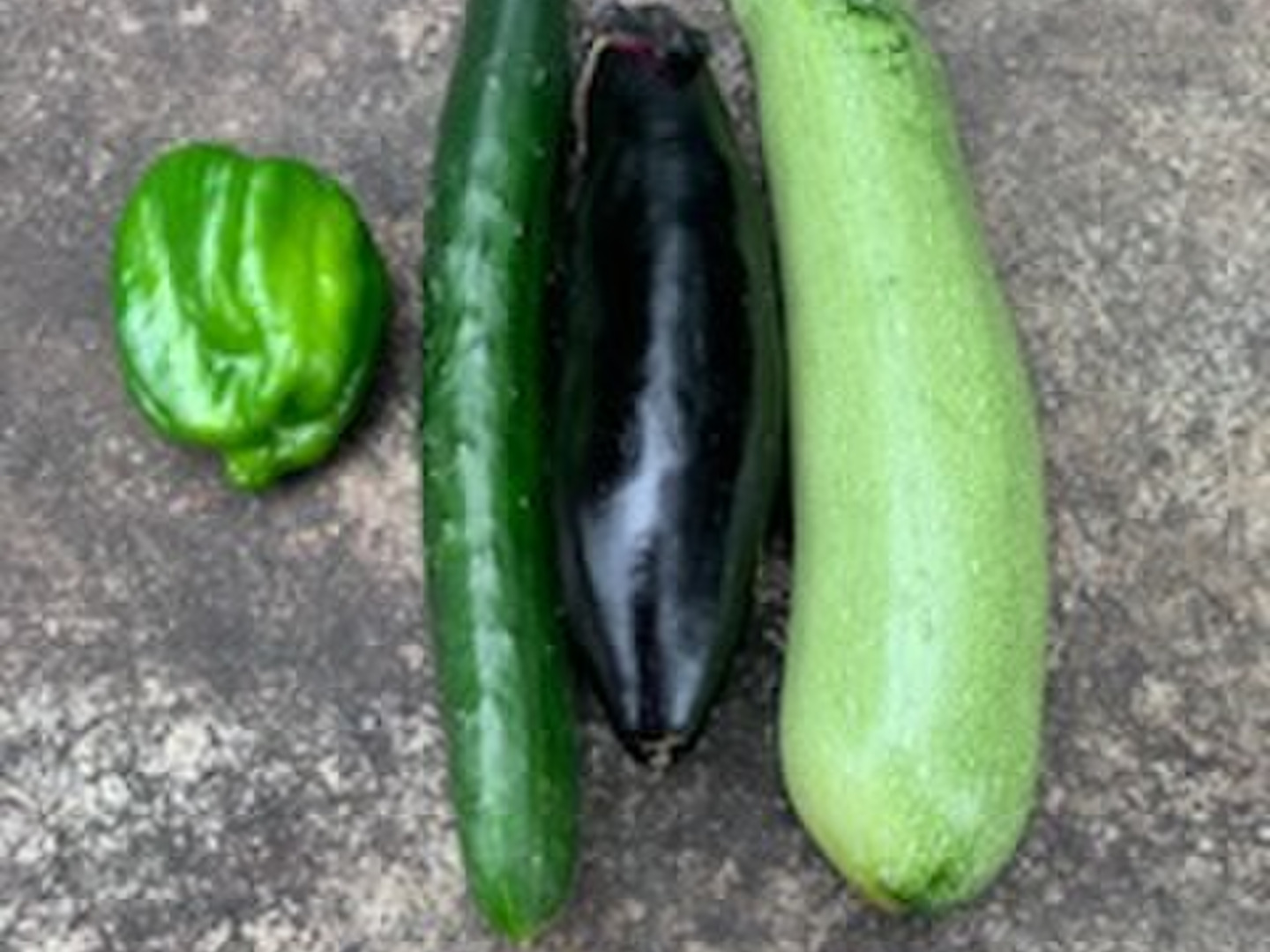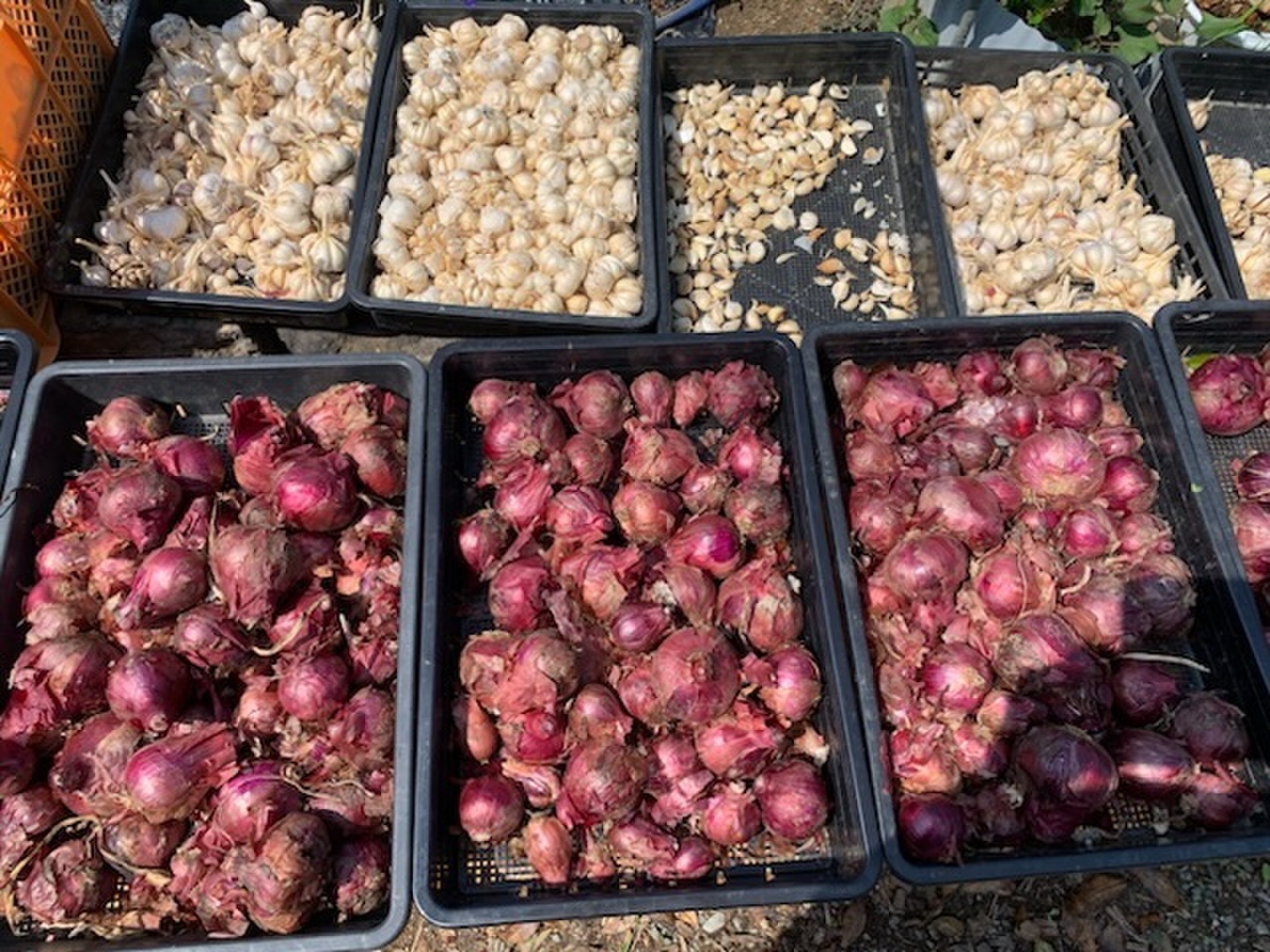 写真を参考にされてください、赤タマネギ5〜6個ほどニンニク3個ほどインゲン豆500グラムほどパセリ2〜3本ほどパクチー70グラムほど、ズッキーニは1本ナスは1本などでです。