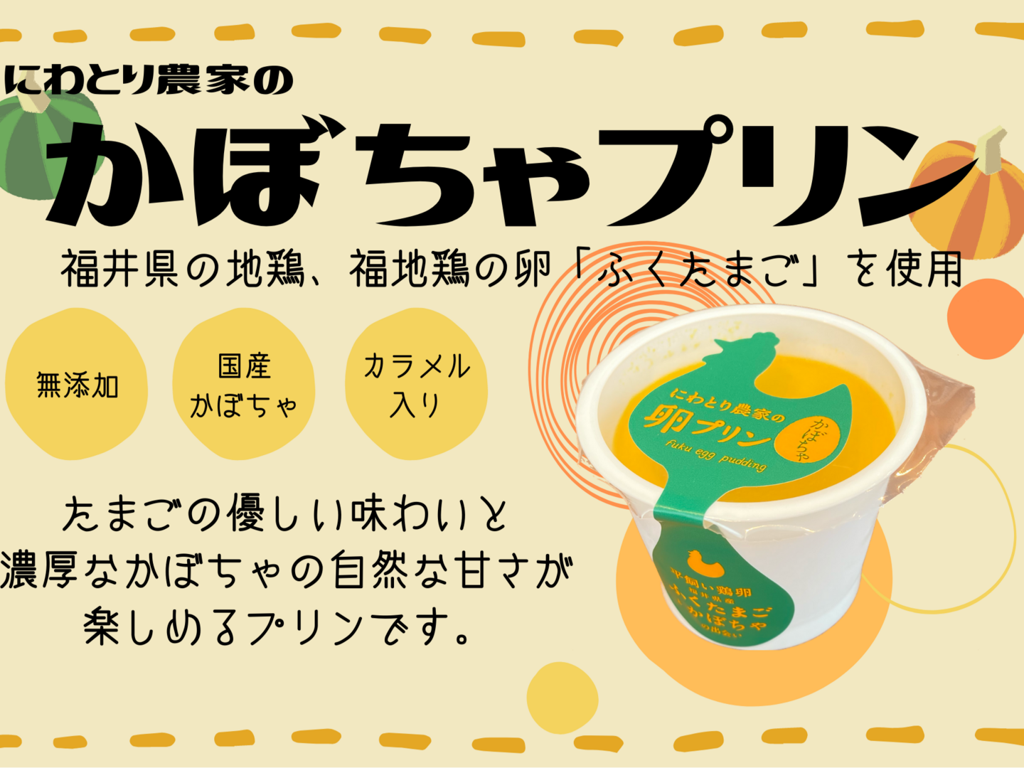 福地鶏の卵「ふくたまご」をふんだんに使用した卵プリンとかぼちゃプリンです。