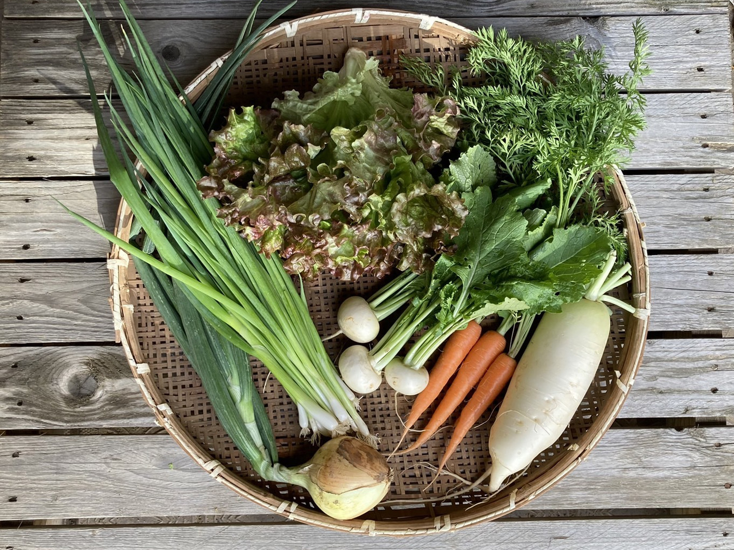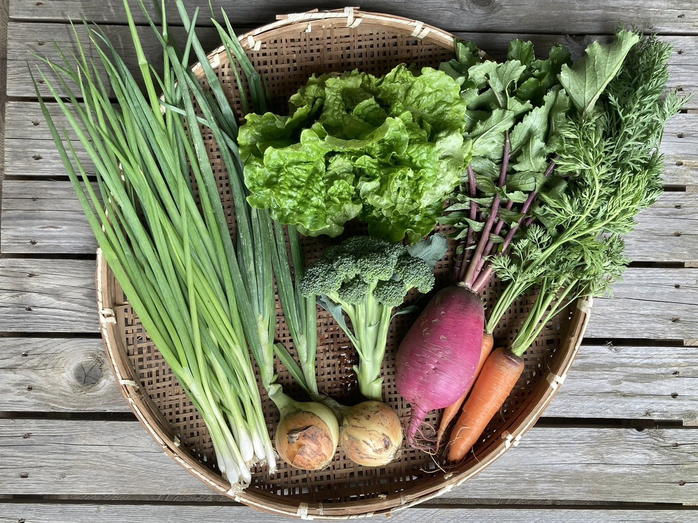 グリーンピース・スナップえんどう・新玉ねぎ・リーフレタス・ズッキーニ・キャベツ・ブロッコリー・スティックセニョール・コネギ・小松菜・大根・赤大根・小カブ・ラディッシュ・水菜・にんにく・葉付き人参など