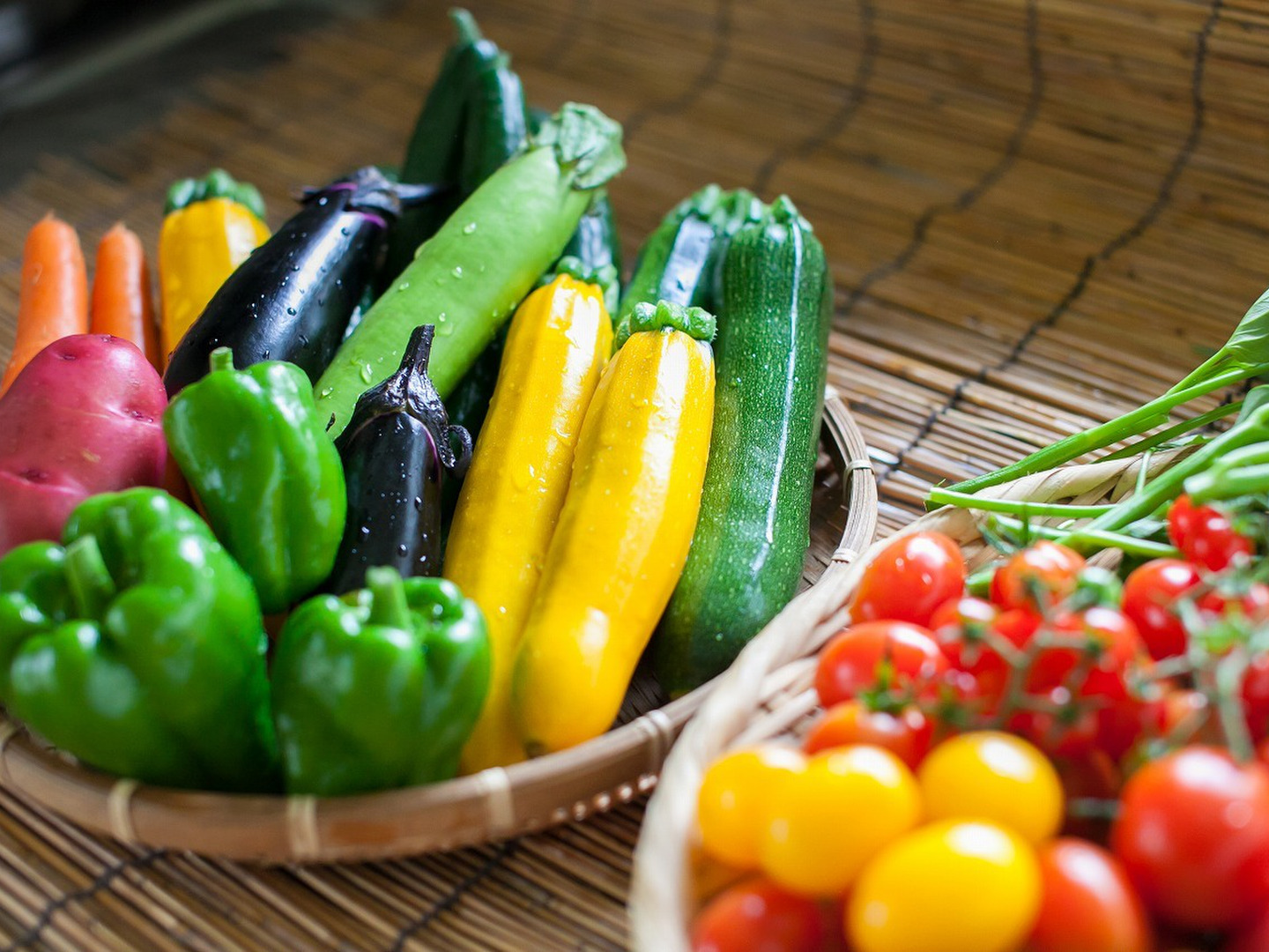 トマト(大玉・中玉・ミニ)・ナス・ピーマン・キュウリ・枝豆・モロヘイヤ・空心菜・オクラ・ゴーヤ・モロッコいんげん・バジル・新じゃが・玉ねぎ・人参など