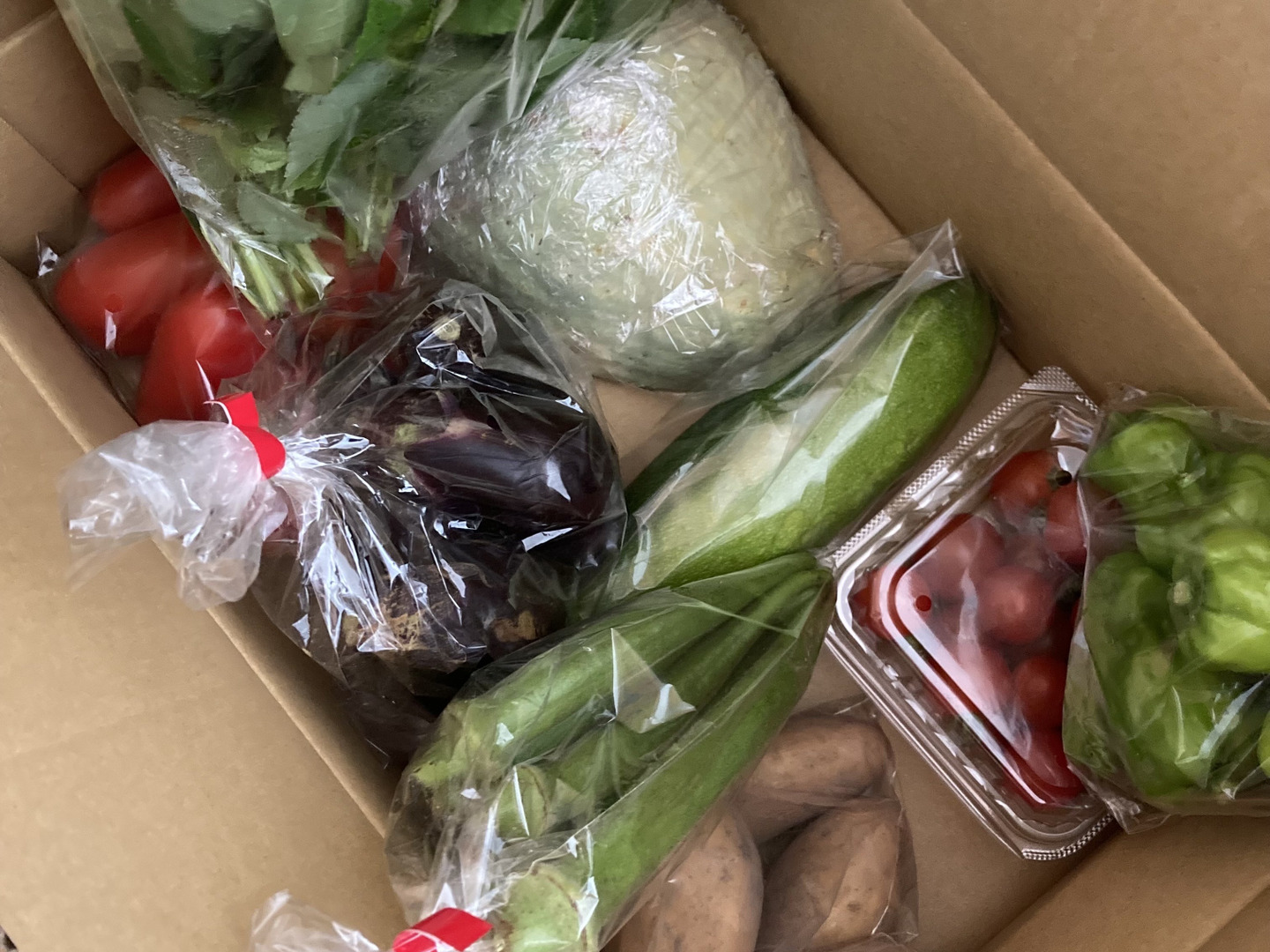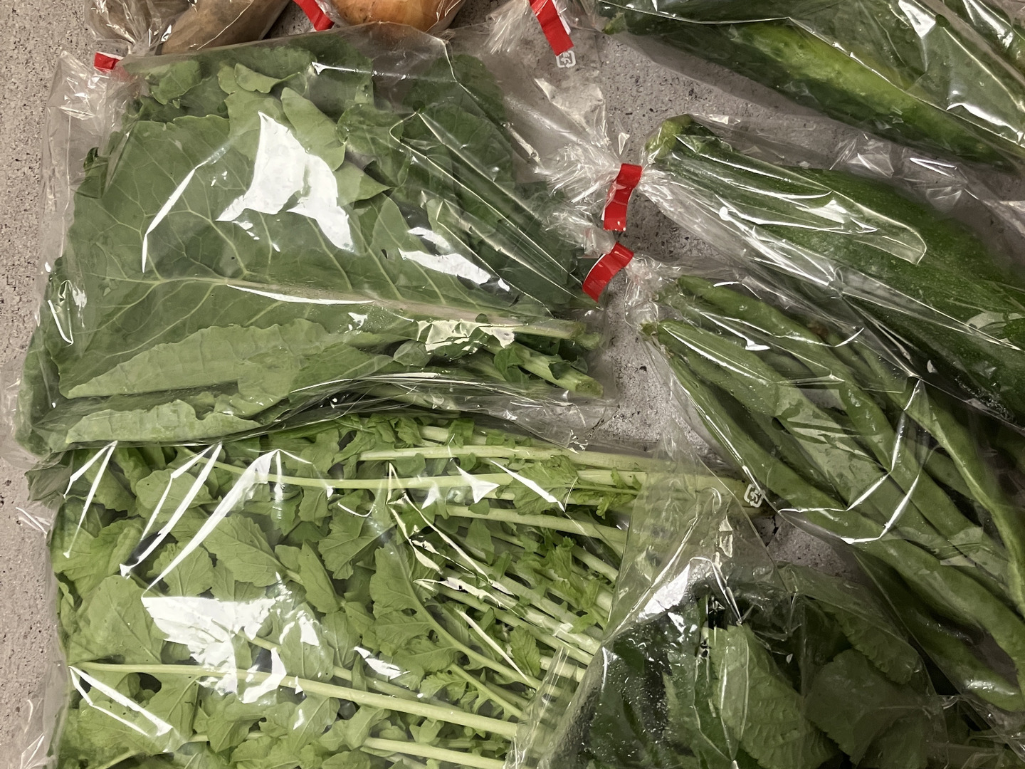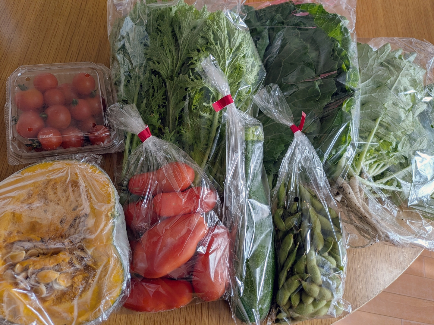 今なら、大根、白菜、キャベツ、ルッコラ、善光寺雪菜、小松菜、山東菜、野沢菜若どり、ケール、紅カブ、カボチャ、サツマイモ(紅東)、菊芋、ヤーコンなどから7〜8品目が入ります。