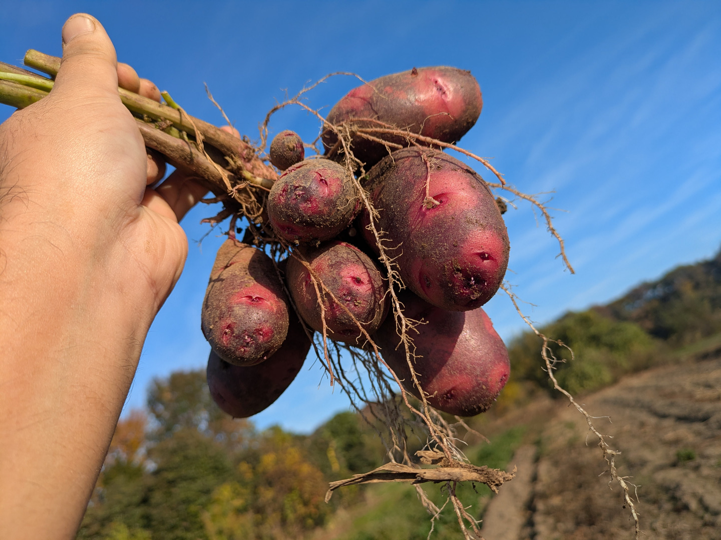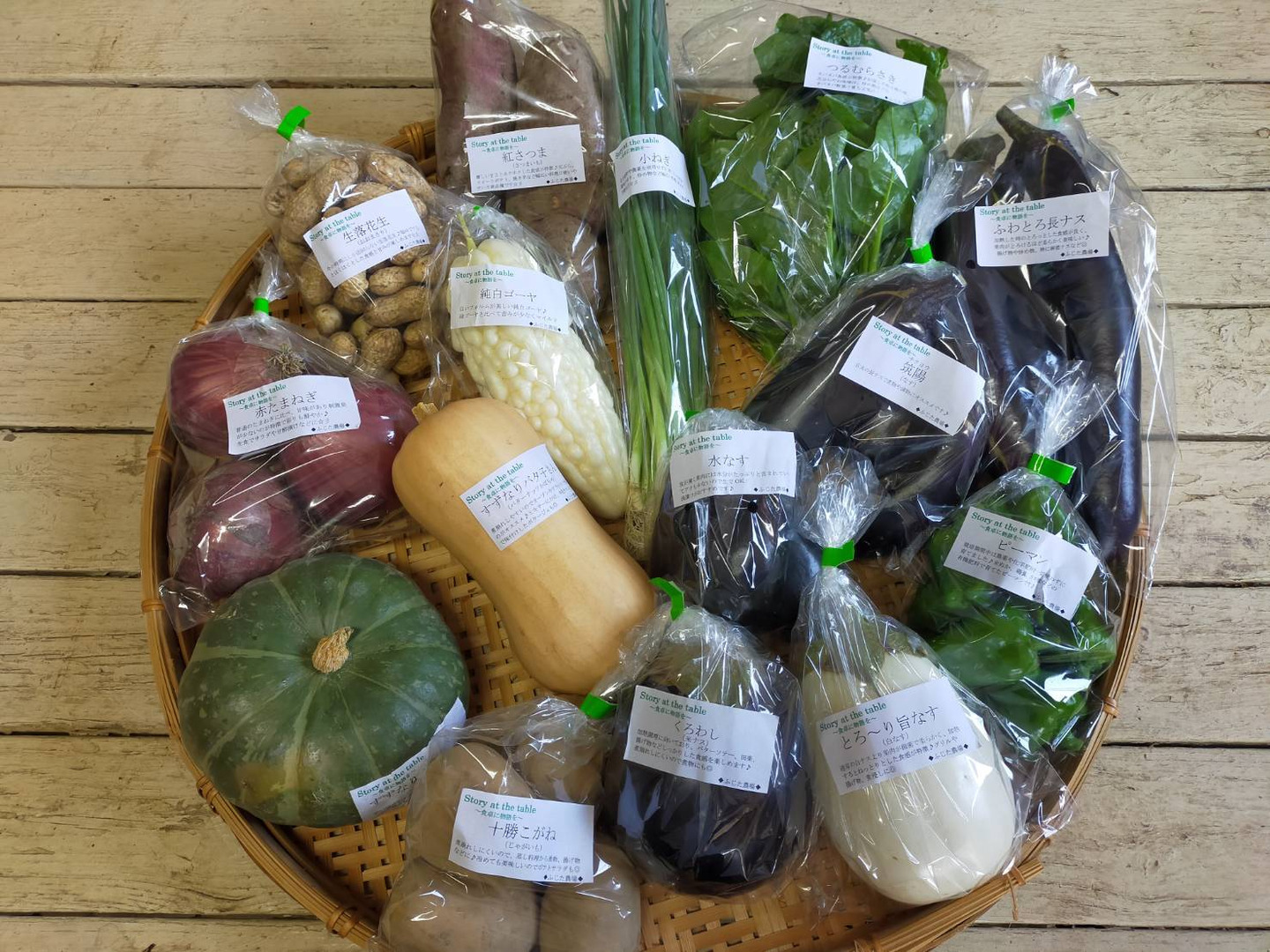 グラウンドペチカ(じゃがいも)、サツマイモ、白菜、ビーツ、寒締めほうれん草、ルッコラ、小松菜、紅くるり大根、ビタミン大根、紅芯大根、にんじん、スティックセニョール、ブロッコリー、カリフローレ、菊芋などの中から厳選した7品種前後を入れさせていただきます!