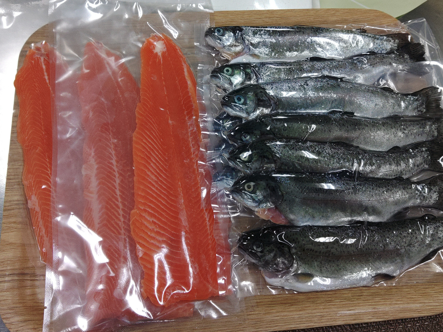 お酒が進む 逸品です 渓流お刺身サーモン 3枚~6枚約1kgと ニジマス 塩焼き用 下処理済み 甘塩 5尾×2パック