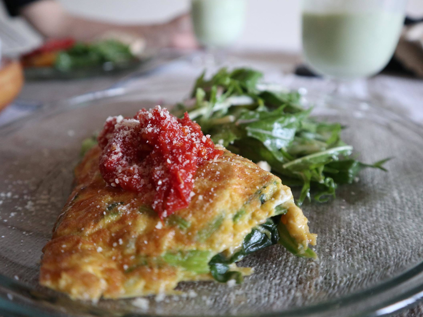 写真は実際にこのトマトソースを使ったもので、オムレツにトマトソースを添えたもの、じゃがいも・人参を加熱してココットに入れたものにトマトソースを加えて温めたものです。