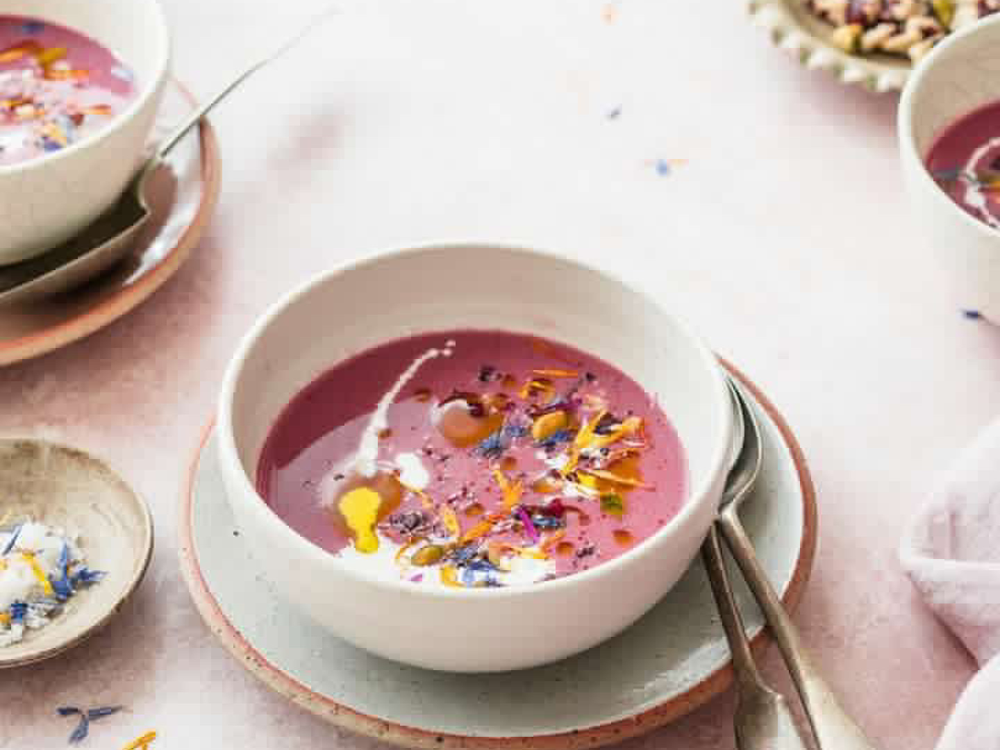 まるごとかぶりつくのが良いですが、削ぎ落とした実を料理にするのも。大和ルージュは芯の部分も赤く、また濃い旨みがあるので、実と一緒に芯も入れてご飯と炊くと、色はまるでお赤飯のようになり、トウモロコシの風味と旨みがギュッと詰まった一品に。アントシアニンの水に溶ける性質を活かして、芯やひげ、実を茹でて赤色の汁を使って、スープやスイーツにも。大和ルージュの赤でお料理に彩りと笑顔を。