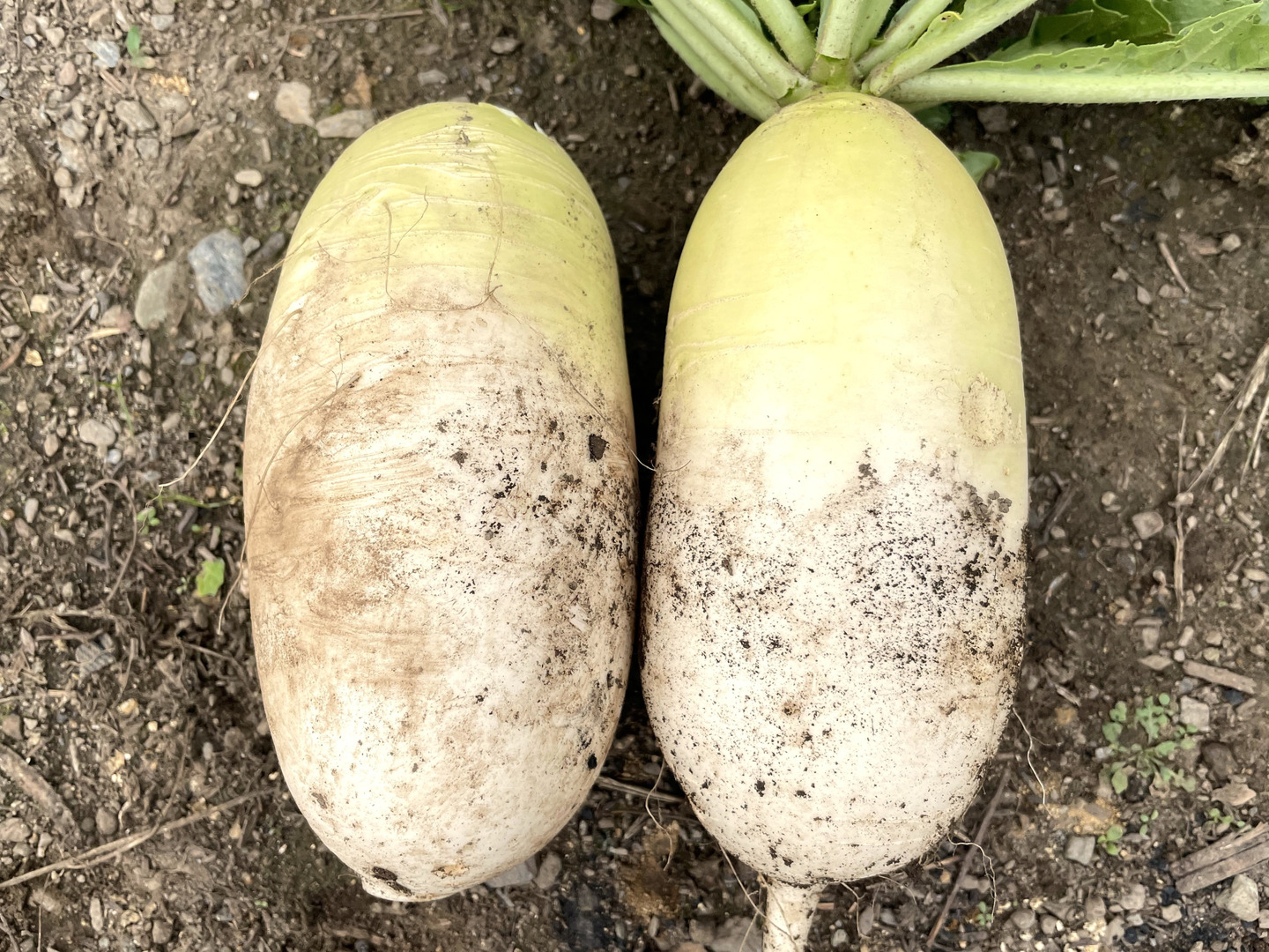 一般的な大根よりも小ぶりで、肉質は硬めです。硬めの歯ごたえを生かしたカクテキ(ダイコンキムチ)作りもお勧めです!