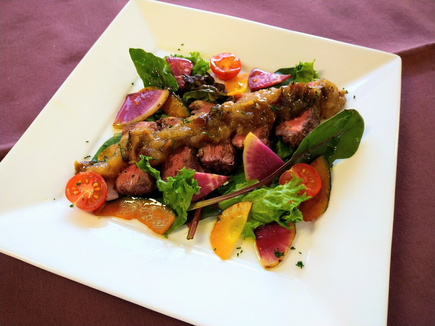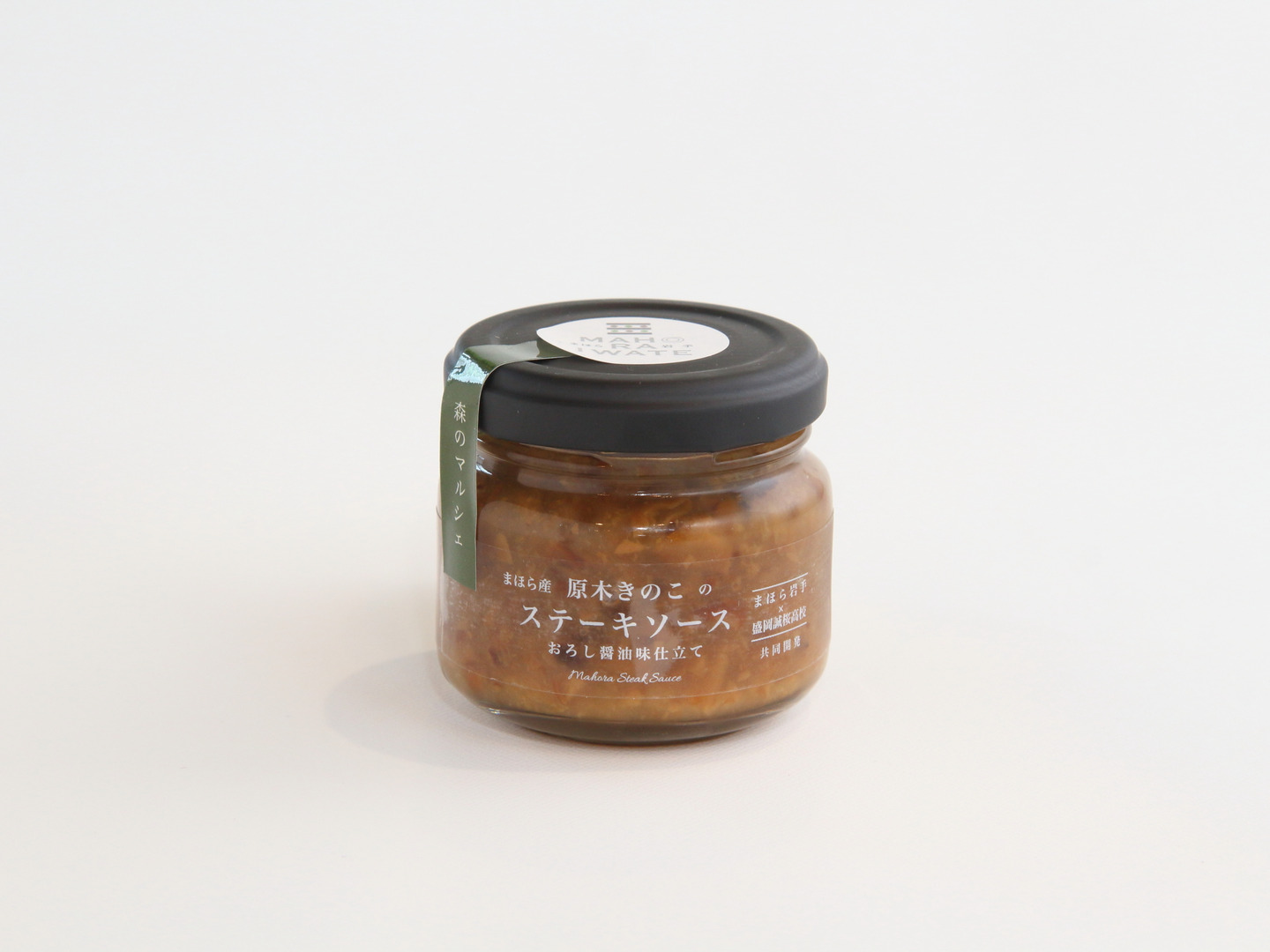 原木きのこのステーキソース:大小に切った原木なめこがたっぷり入っており、きのこの風味や食感が味わえます。その他に大根やゆずを使用し、さっぱりとした和風味に仕上げました。