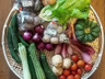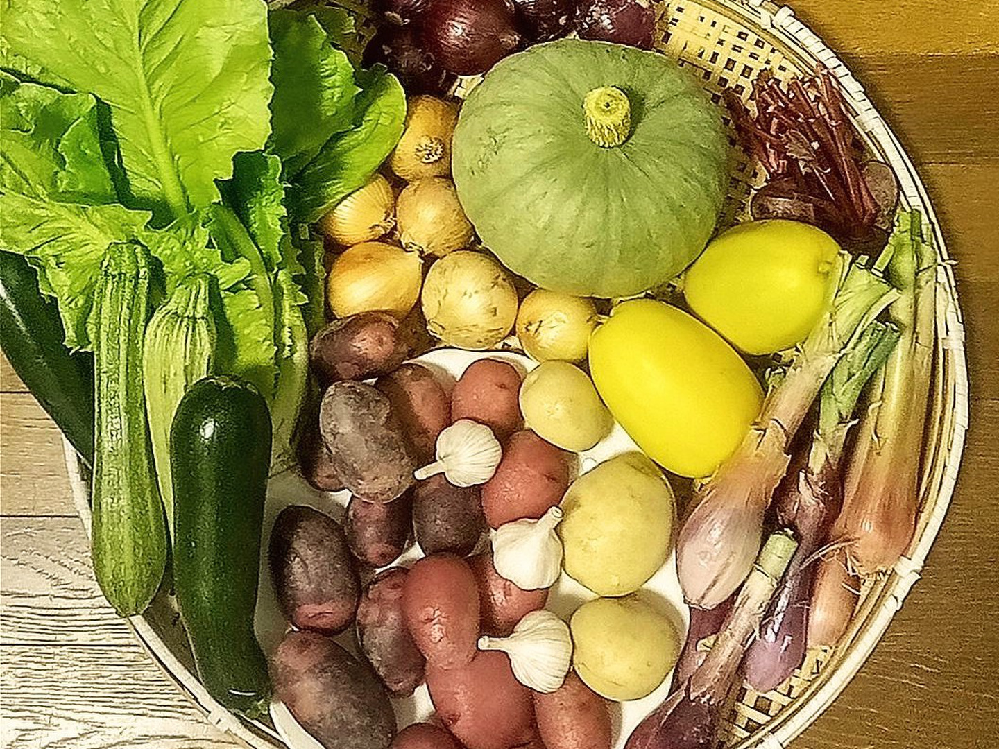 現在収穫中或は収穫を始めたばかりの季節の野菜8〜10品目程度を80㌢サイズの箱一杯に詰めたボリューム感、カラフル感満載の野菜セットです。お野菜の種類はホクホク系のカラフルな「かぼちゃ」「日本かぼちゃ」「ズッキーニ各種」「中玉トマト」「ミニトマト」「レア系の新ジャガイモ各種(赤、紫系もあります。)」「ロメインレタス」「イタリアオニオン」「にんにく」「まくわうり」「スィートコ━ン」等から収穫タイミングでチョイスさせていただきます。