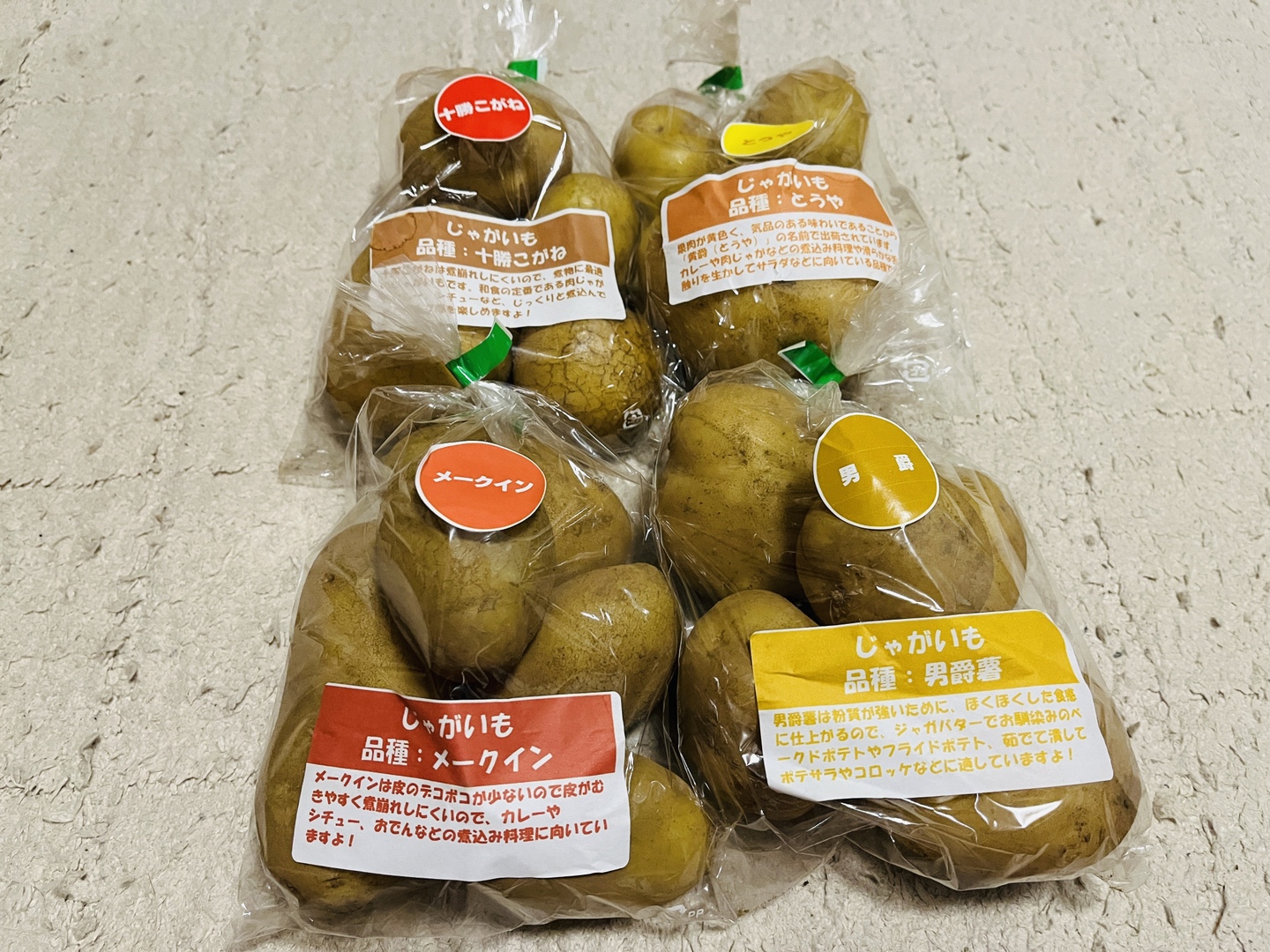 ジャガイモ4品種の食べ比べセットです。品種は「男爵」「メークイン」「とうや」「十勝こがね」でそれぞれ500g(3個~6個)入っています。4品種入った袋にはそれぞれの特徴をシールにして貼ってあります。調理の時に参考にしてみて下さい。栽培期間中は農薬不使用です。安心して食べてみて下さい。