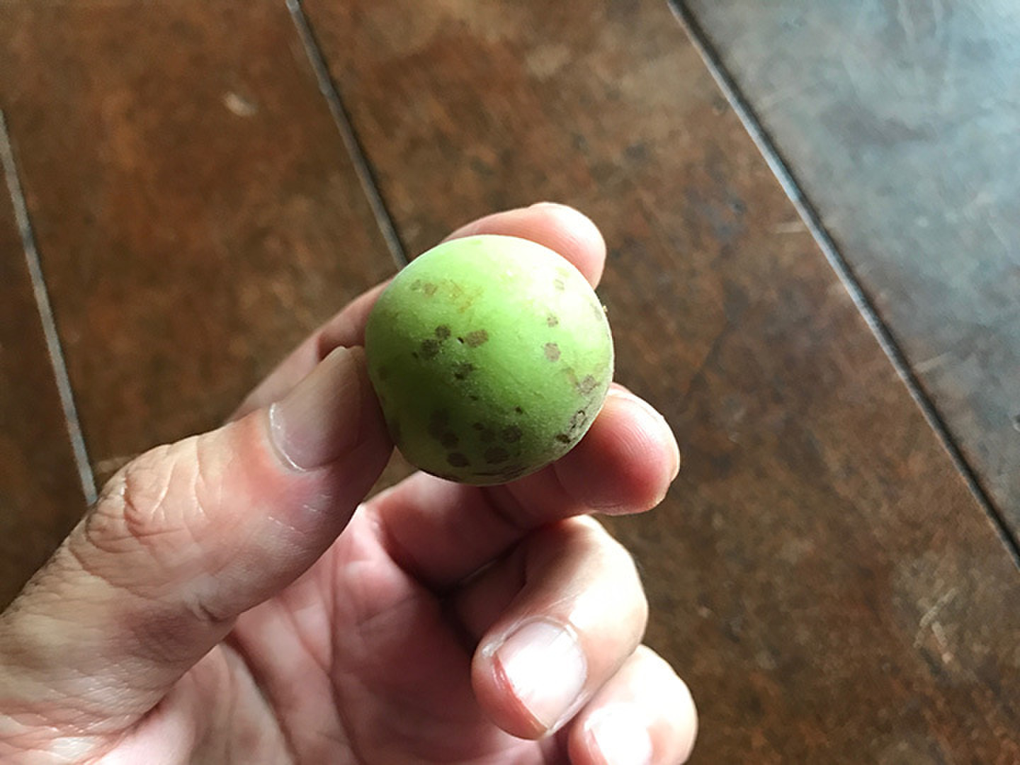 お預かりした遊休農地のある梅の木。その梅はすでに手入れは行き届いていない状態でしたが、今年たくさんの実をつけてくれました。しかし、枝が混み合っていたことと、農薬を使わずに育成してきたことにより、写真のように黒い斑点や傷が多く出ていますが、どうしてもこのような農薬を使っていない梅で梅仕事がしたい!という方の声にお応えすべく、販売させていただくこととなりました。