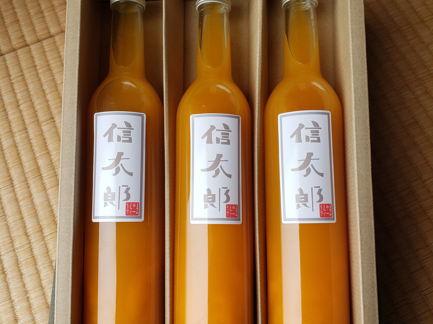 年越し1月に収穫した温州みかん。皮をむいて丁寧に絞ってつくったジュースは 果実の旨みがギュッと濃縮されていて、一度飲んだらやめられないおいしさです。