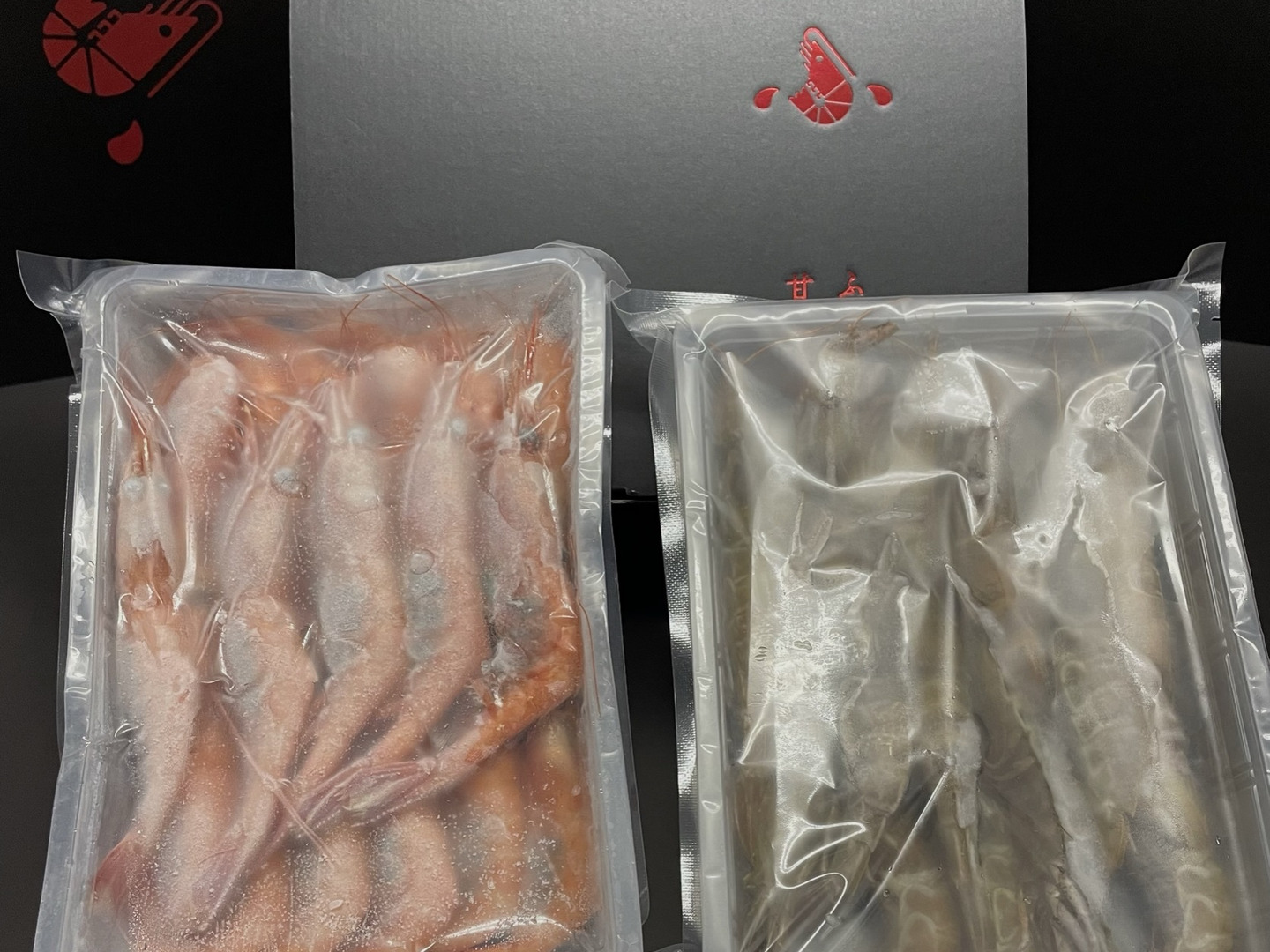 ⭐️漁師の味付け 忙しい毎日の夕食に 時短殻むきの手間なし!ちょっと贅沢だけど、すぐに食卓に!ふく福甘えび[味付け剥き身甘えび二種]醤油漬け+生姜漬け 各120g×2袋 約40匹