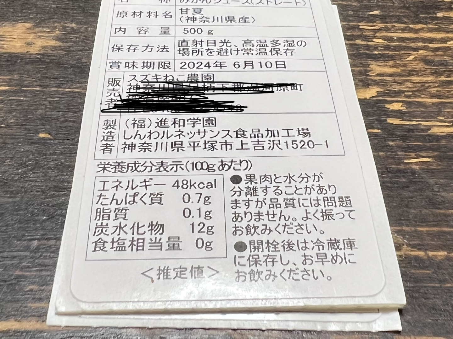 商品について あわせ買い対象 同生産者の別の「あわせ買い対象」商品と一緒にご注文いただくと、送料をまとめてお届けできる場合があります。 内容 甘夏ストレートジュース1本 発送 ヤマト運輸(食べチョク特別送料) 送料 ¥ 常温便 + ¥ 0 数量1点ごとに送料が発生します。 種別 果物 みかん・柑橘類 果物 その他柑橘 スルガ甘夏 加工品 飲料 フルーツジュース 果物 甘夏 ニューセブン 加工品 飲料 ジュース 産地 神奈川県 農薬化学肥料不使用 果物 加工品 贈答品 ビニール包装 紙包装 フルーツジュース スルガ甘夏 ニューセブン ジュース 神奈川県x果物 神奈川県x加工品 神奈川県xみかん・柑橘類 神奈川県xその他柑橘 神奈川県x飲料 神奈川県x甘夏 神奈川県xスルガ甘夏 神奈川県xフルーツジュース 神奈川県xニューセブン 神奈川県xジュース 商品説明 甘夏を皮剥いて搾ったストレートジュースです。使用した甘夏はスルガエレガントやニューセブンなどの新甘夏と在来の甘夏です。グレープフルーツジュースにも似た味わいをお楽しみいただけます。500mlです。下に果汁など沈澱しますので、よく振ってからお飲みください。開封後は冷蔵庫で保存してなるべく早くお飲みください。お酒で割っても美味しいです! もっと見る この商品のことをお友達にもシェアしませんか ポスト シェア