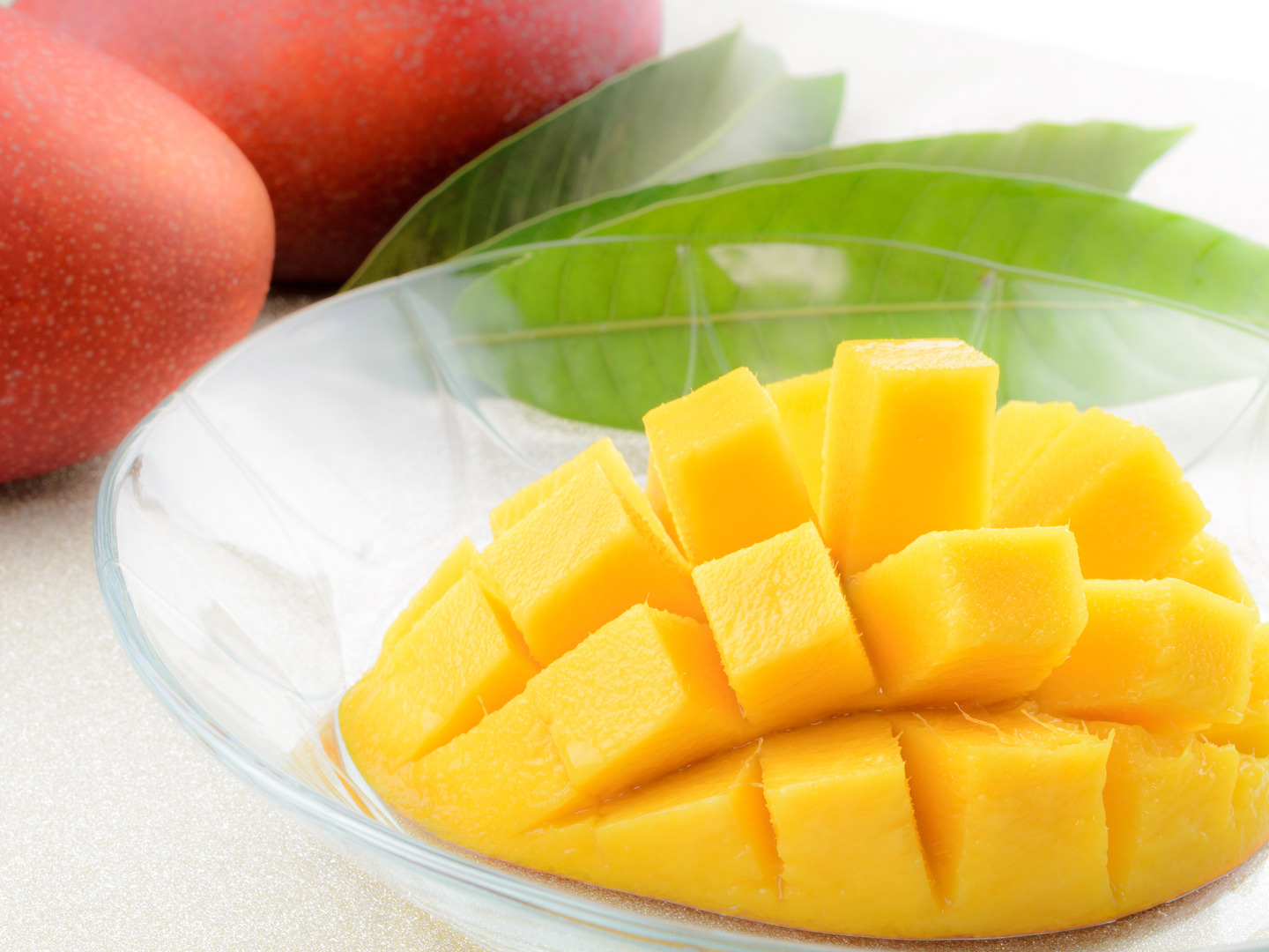 収穫直後のマンゴーにはブルームという白い粉のようなものに覆われていますが、表面にツヤが出て、果実が柔らかくなり、甘い香りがしてくると食べごろになります。