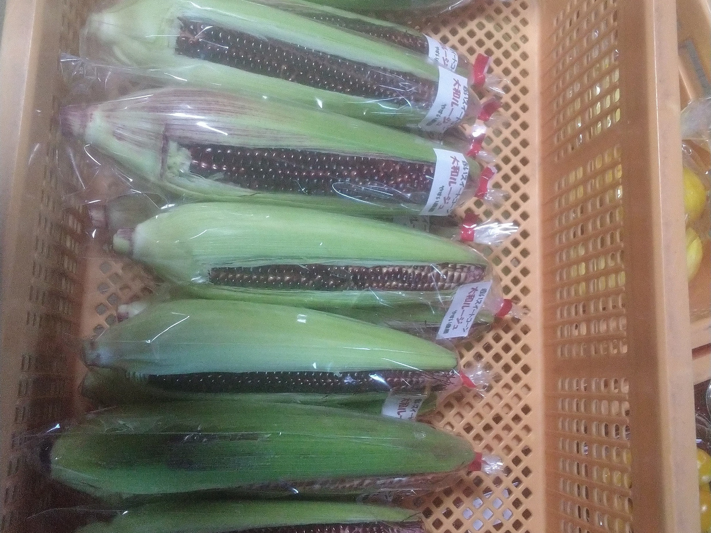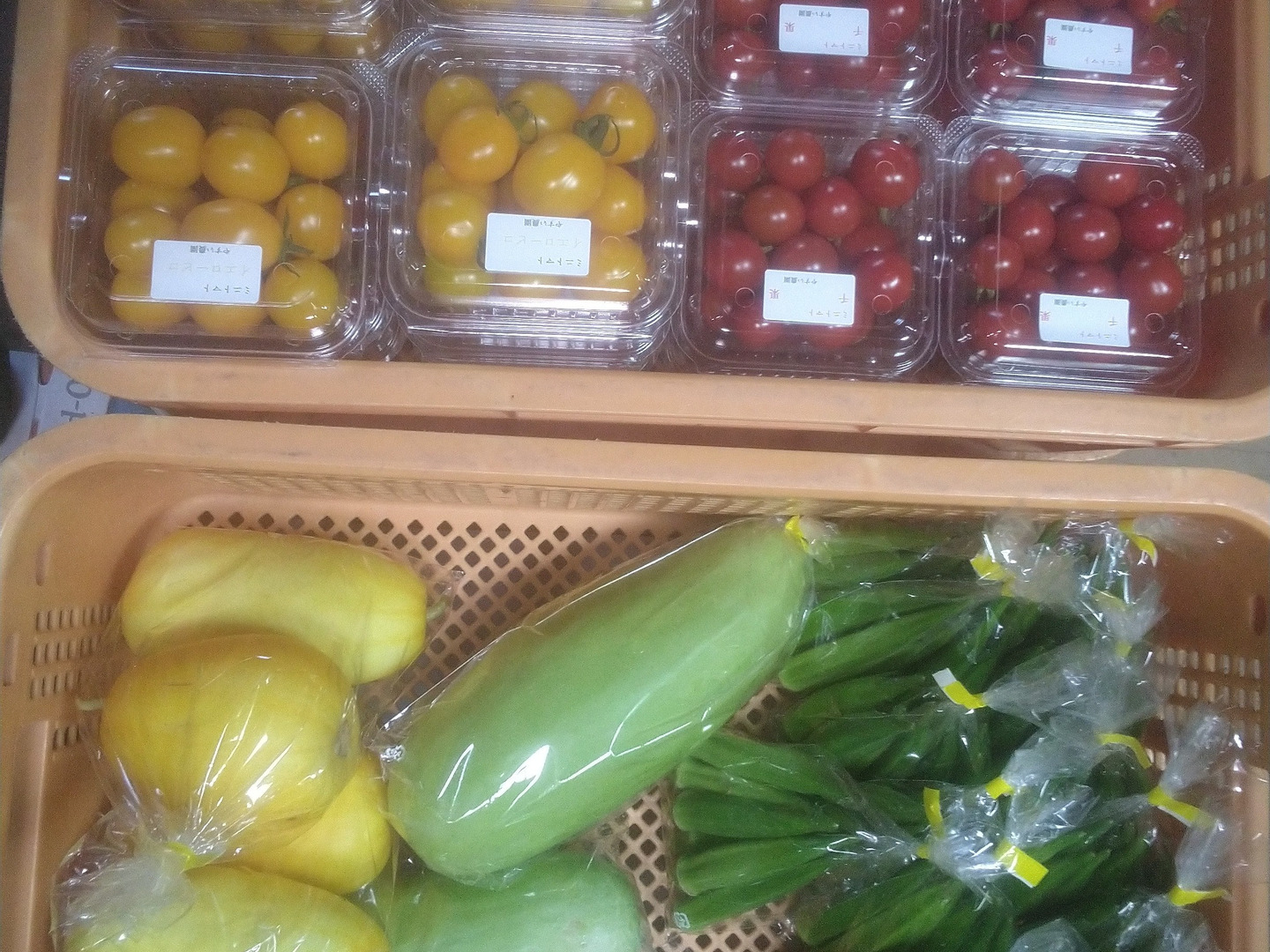 中玉トマトフルティカ・ミニトマト千果・ミニトマトイエローピコ・ミニサイズかぼちゃ・ごうしゅう芋(地元名産)・玉ねぎ・オクラ・肉厚ピーマン・甘党美人・ししとう・ナス・まくわうり(少なくなっています)・赤いスイートコーン大和ルージュ・生鷹の爪(完熟の赤と緑)・人参等