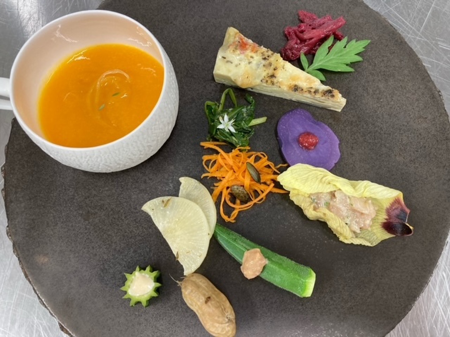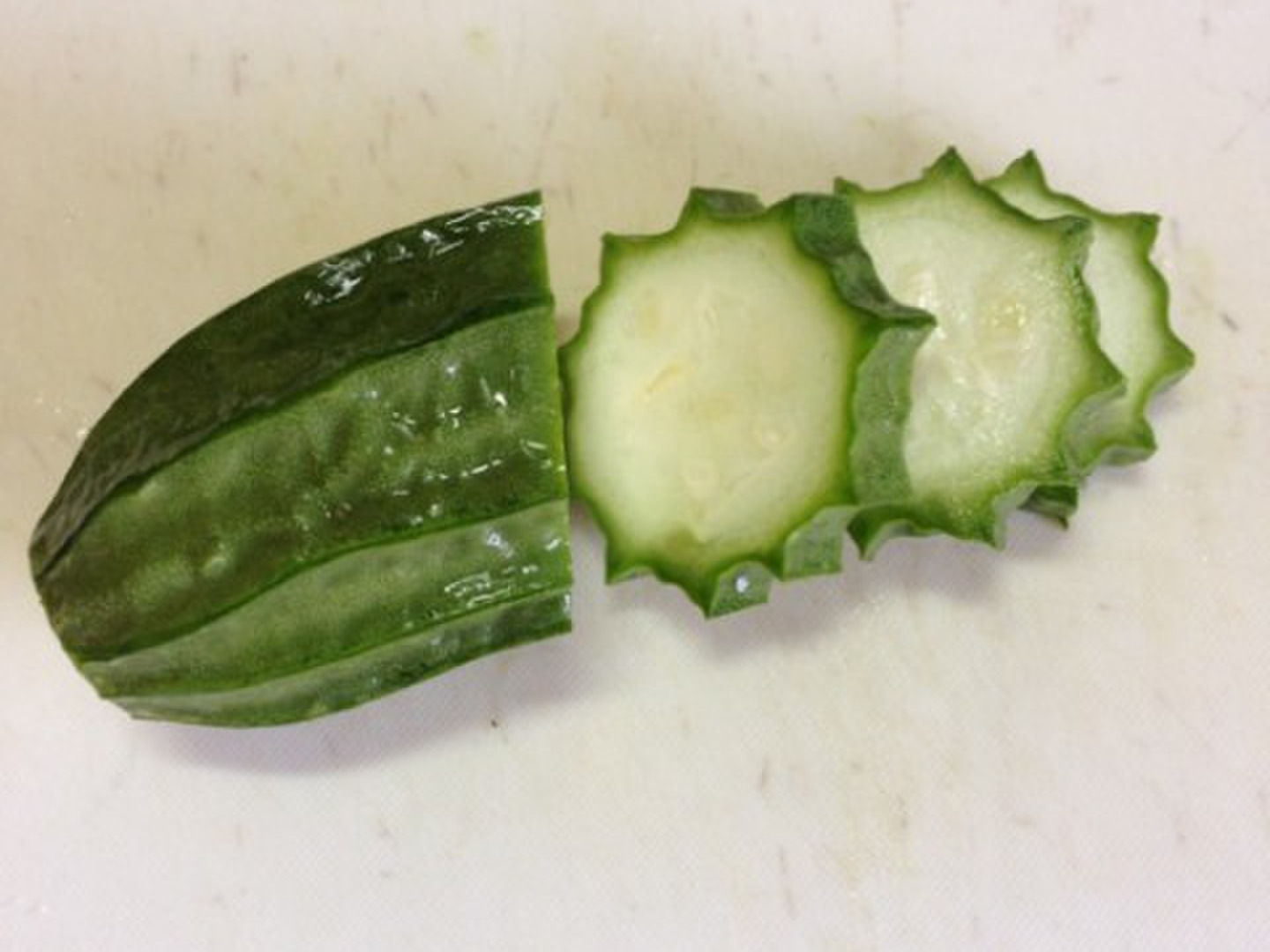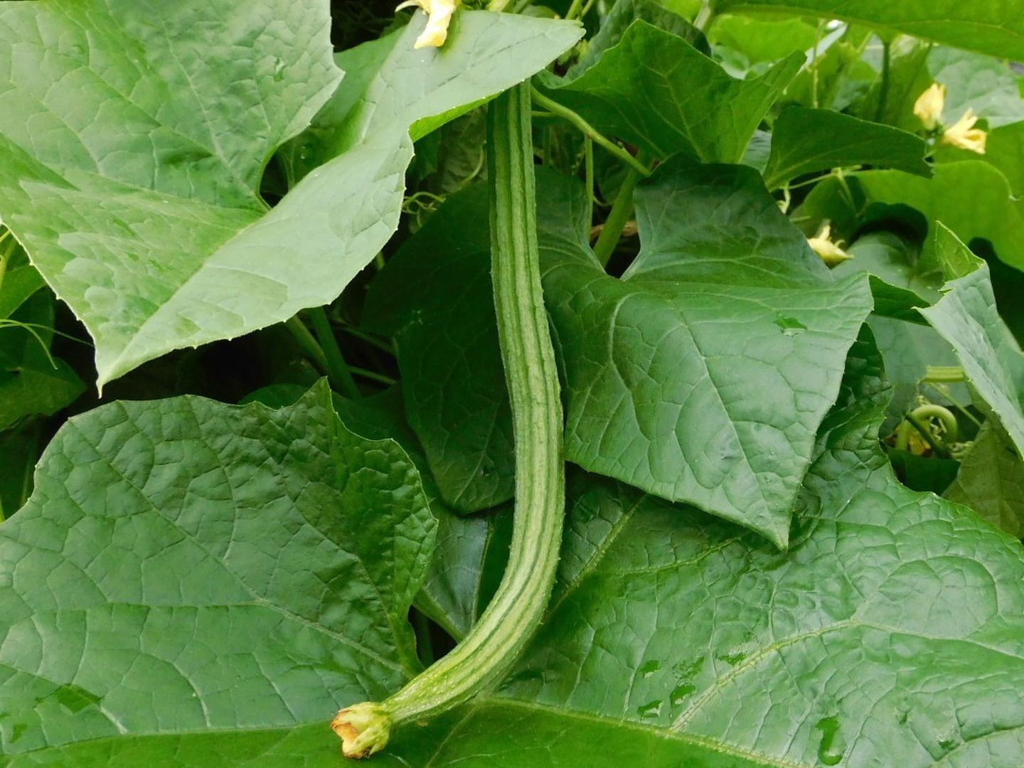 十角へちまは東南アジアでは広く栽培されていますが、日本国内では少なく、富山県の気候に合った十角へちまがようやく実をつけてくれるようになりました。独特の食感が楽しめ、ナスとズッキーニの中間くらいの野菜です。